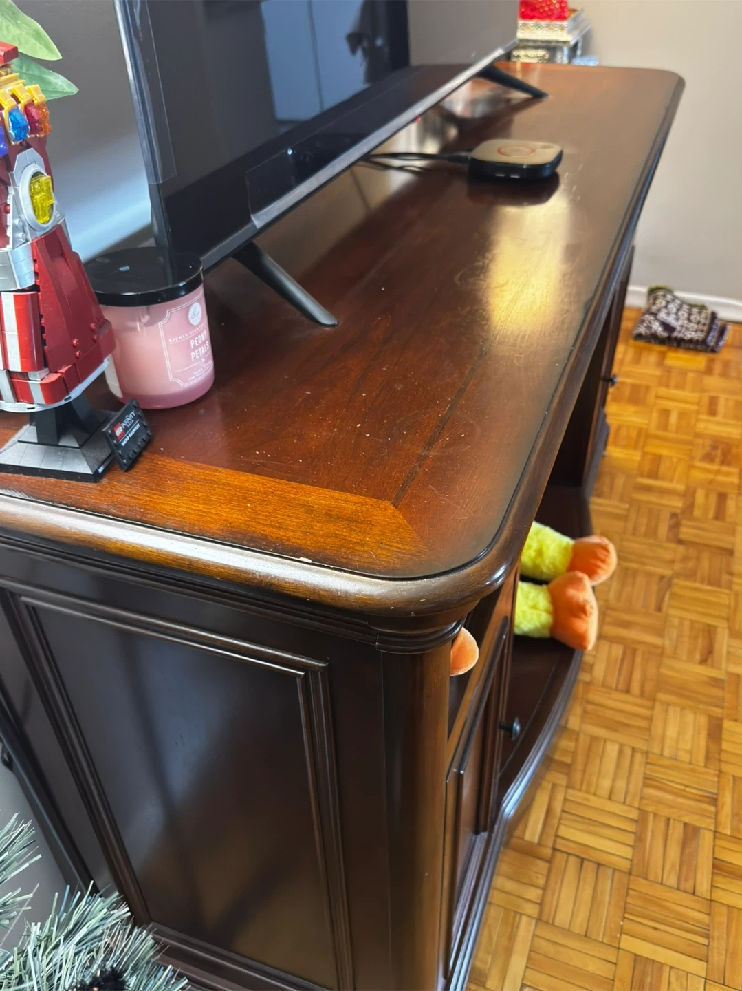 Beautiful, sturdy entertainment center in a rich dark wood finish.