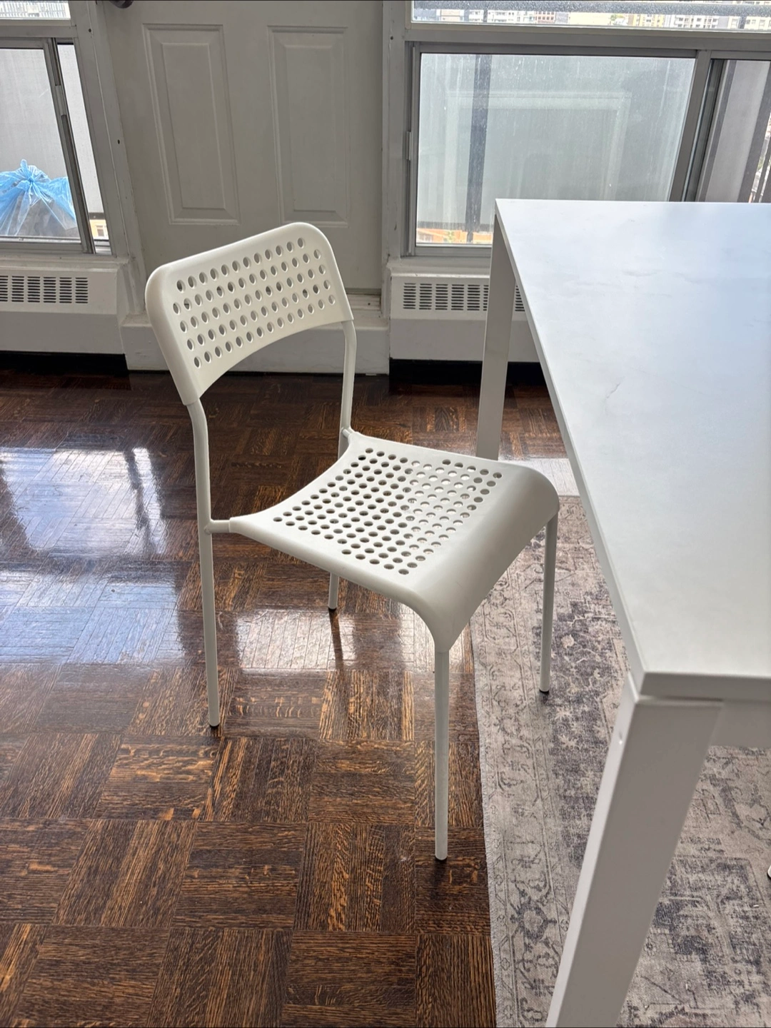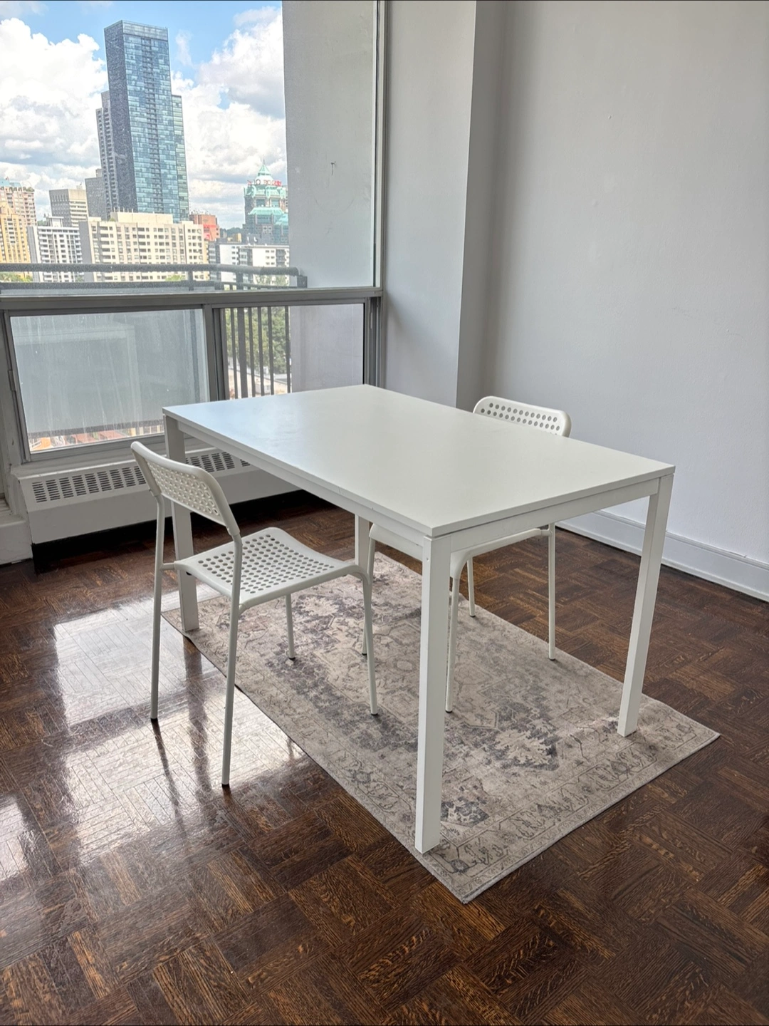 Minimalist white table with a clean finish and compact size. Great for dining, working, or multi-use. Dimensions: