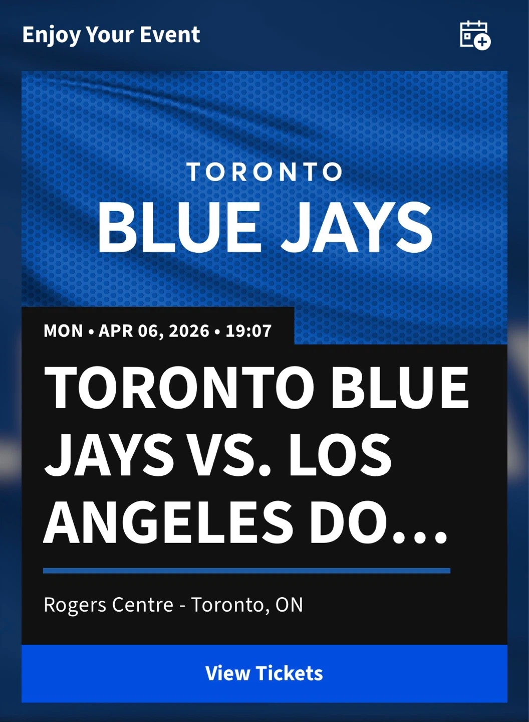 Toronto Blue Jays game ticket for April 6, 2026. This ticket is for the game against the Los Angeles Dodgers at Rogers Centre in Toronto, ON. Game time is 19:07.