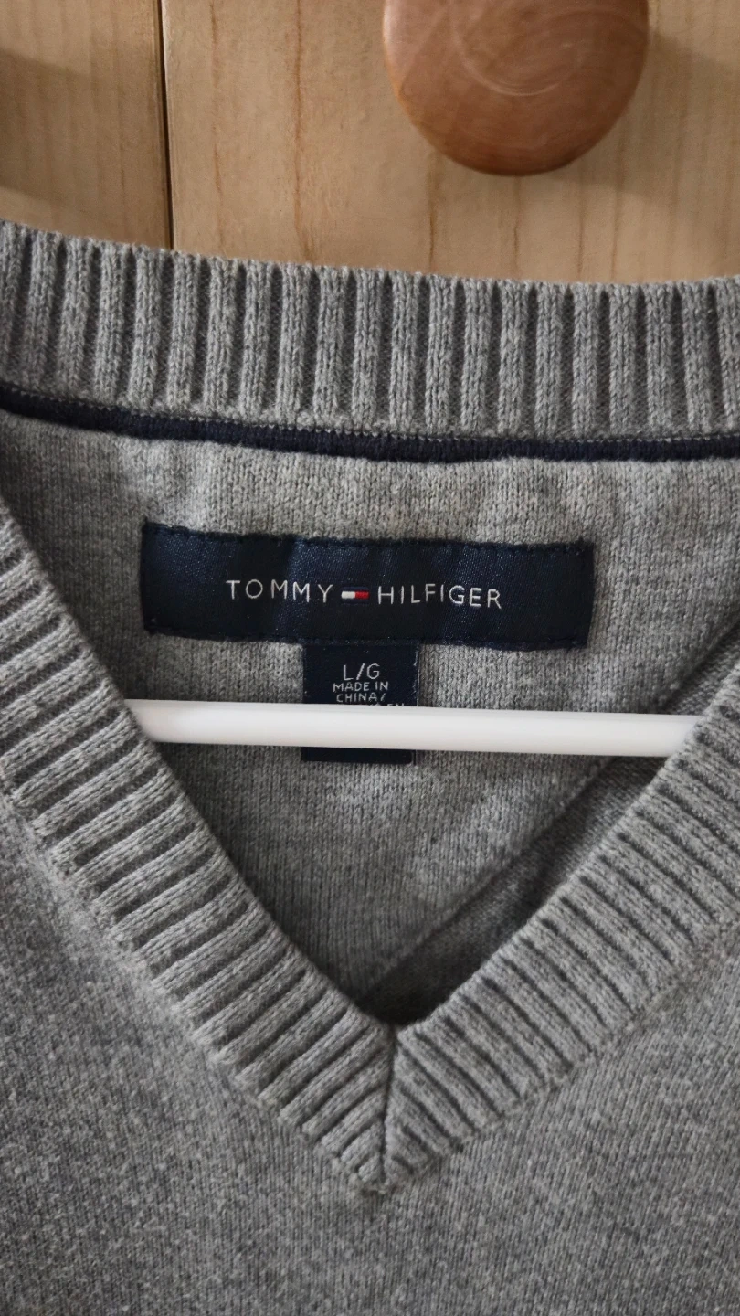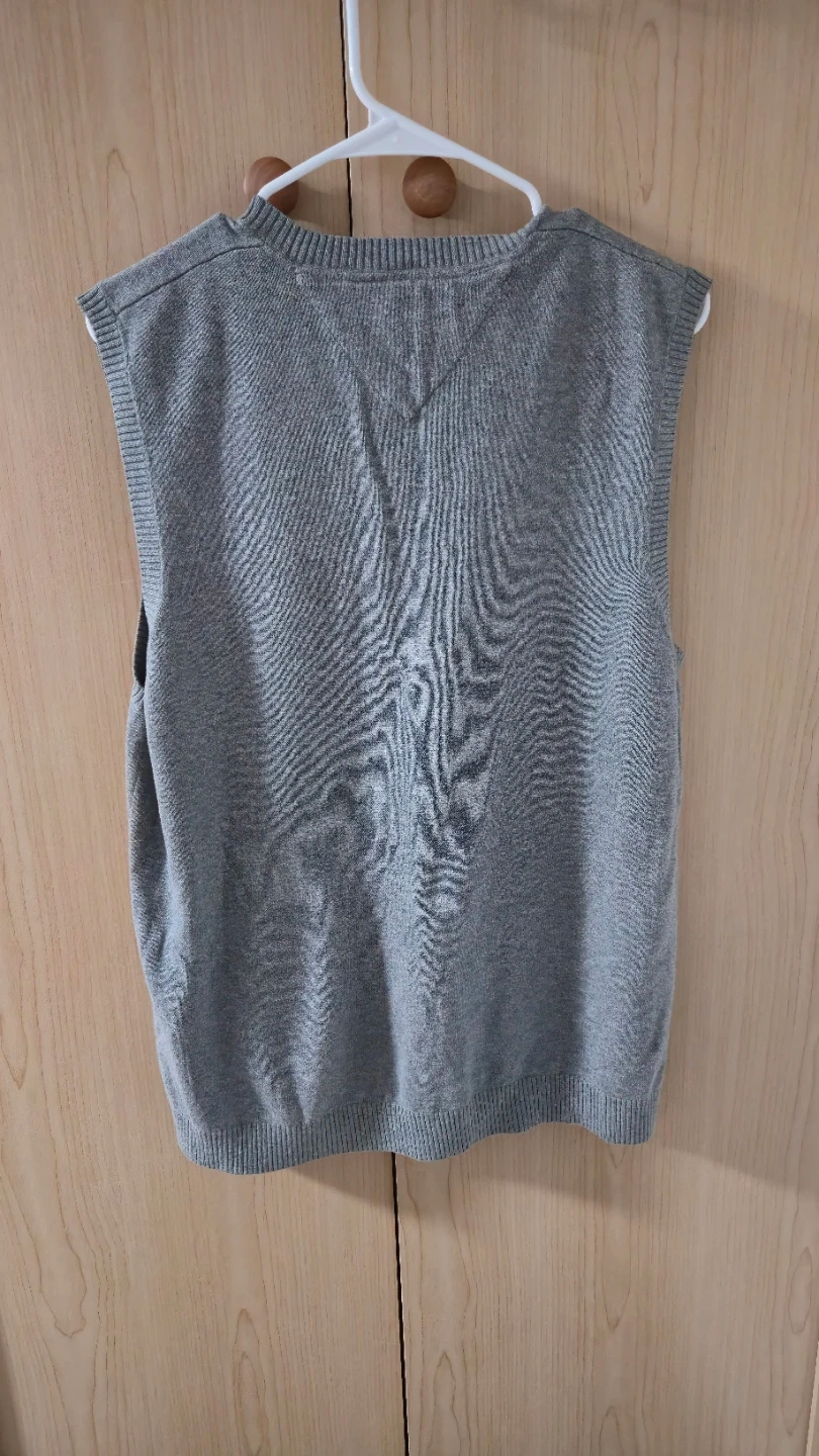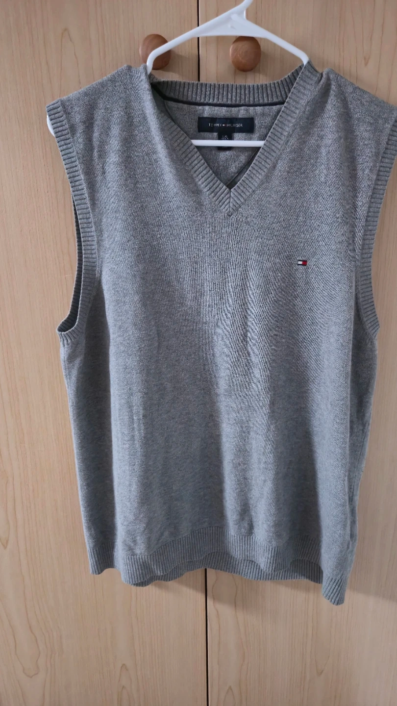 This Tommy Hilfiger sweater vest is grey and a size L. It's made with a knit fabric. This vest is great for layering over shirts during cooler weather!