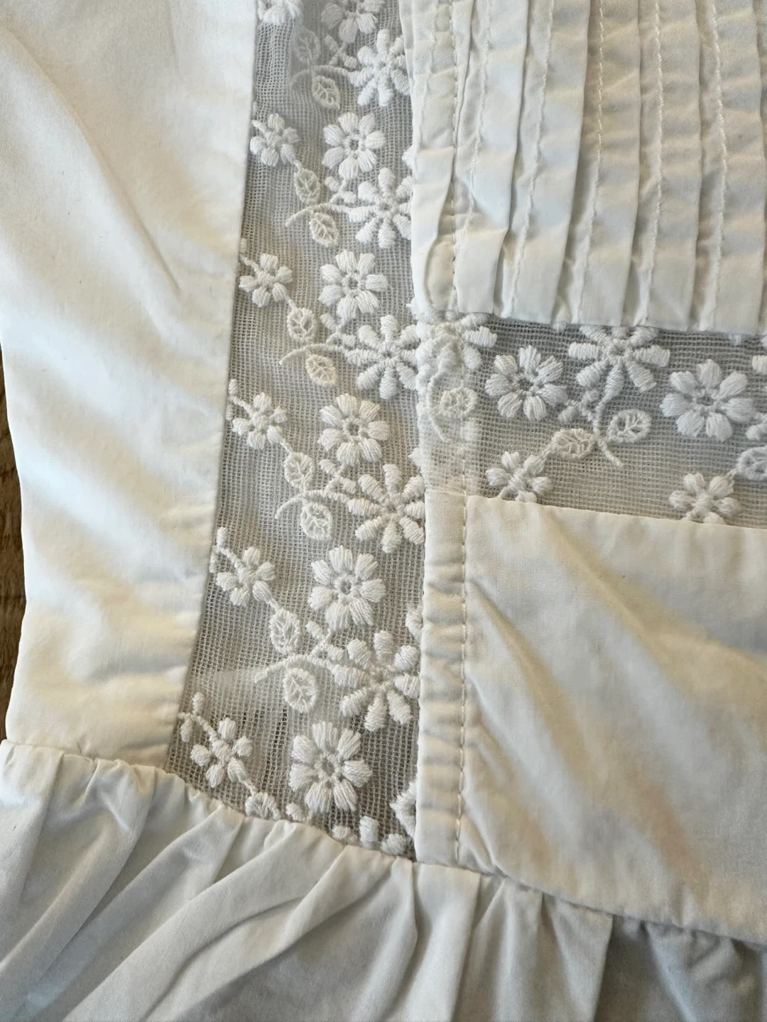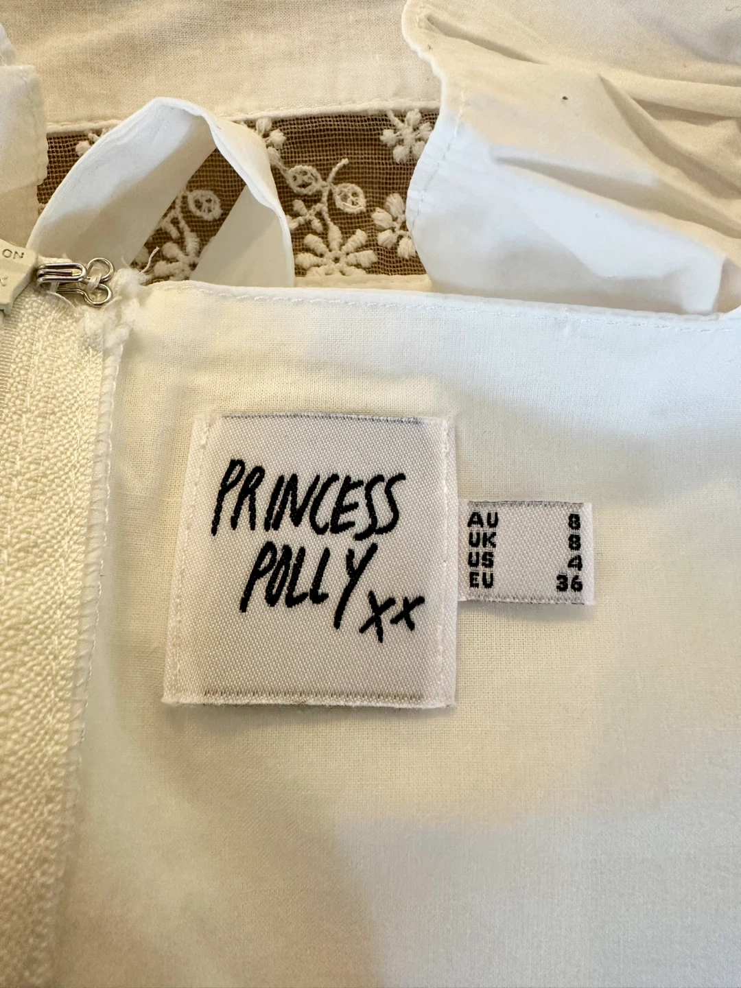 Princess Polly top with lace detailing and ruffled hem. Features adjustable tie shoulder straps and a back zipper. Material is cotton.