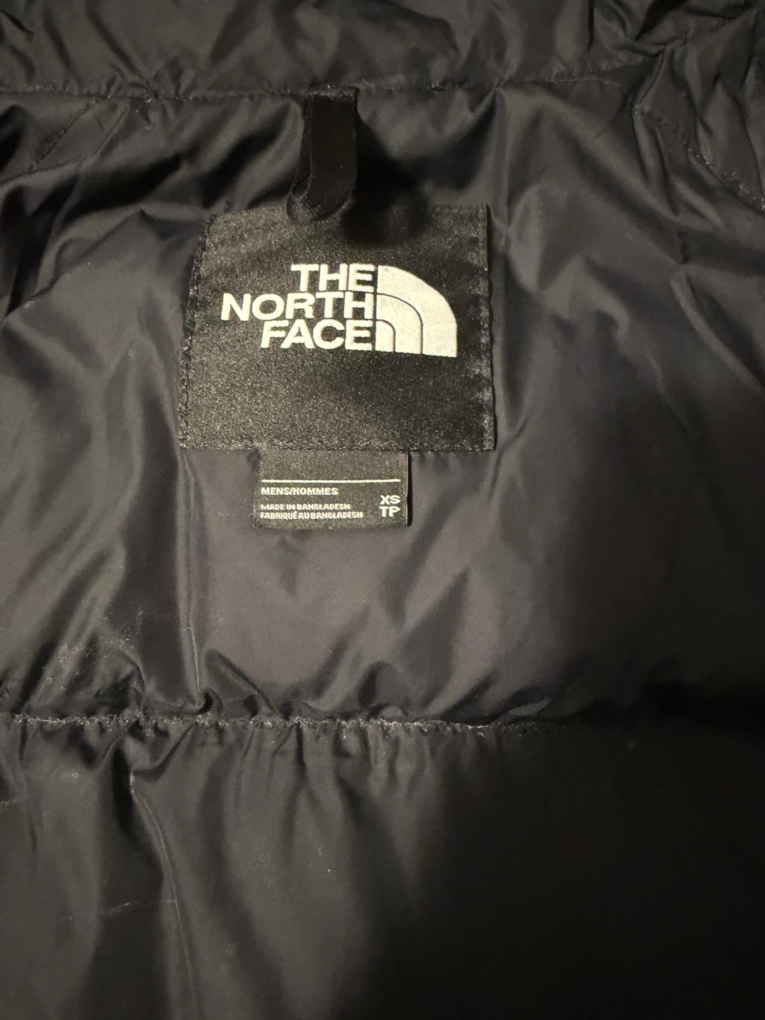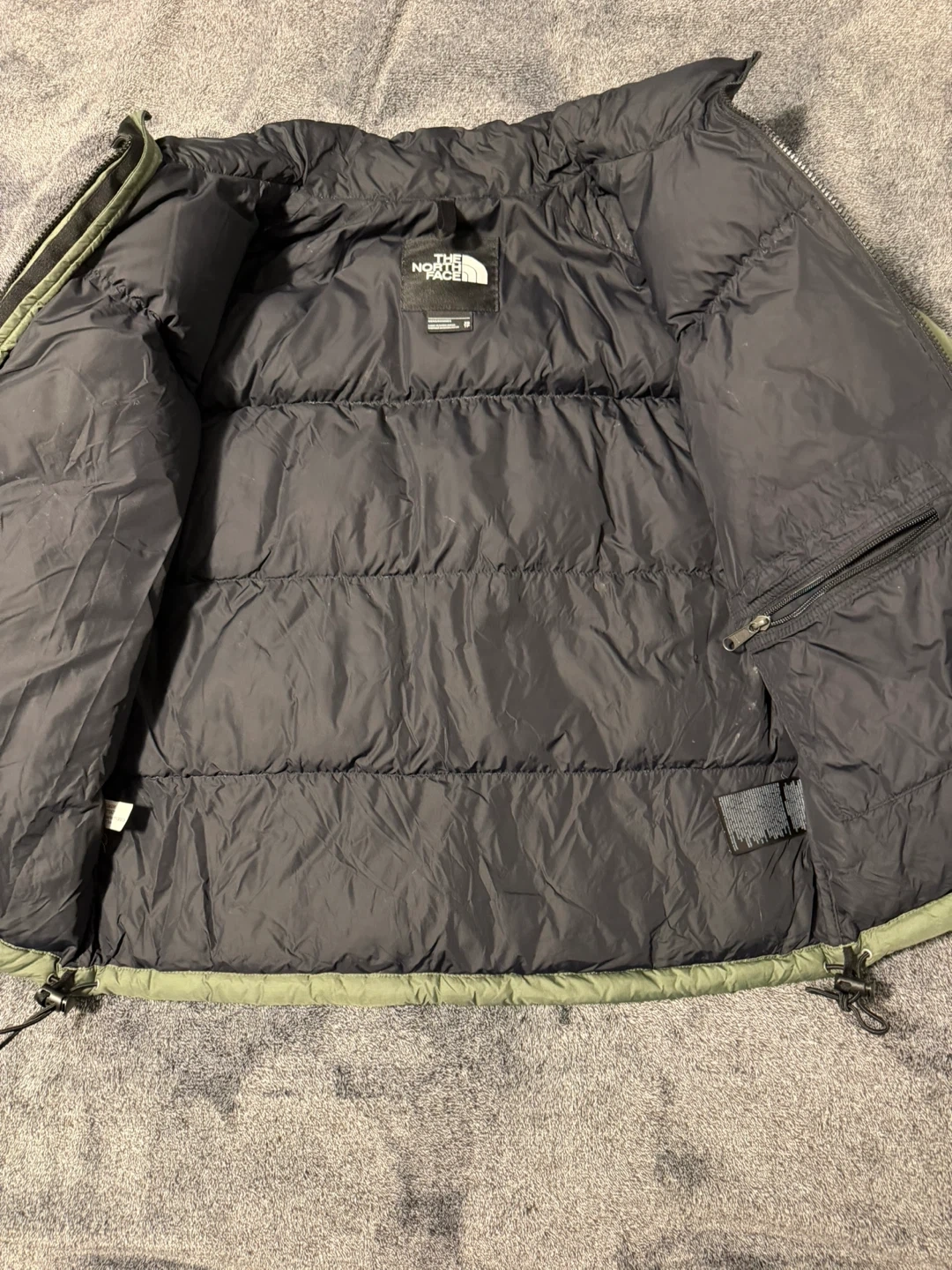 This is a green and black puffer jacket from The North Face. It's a men's XS size. The jacket has zippered pockets and a full zip front.