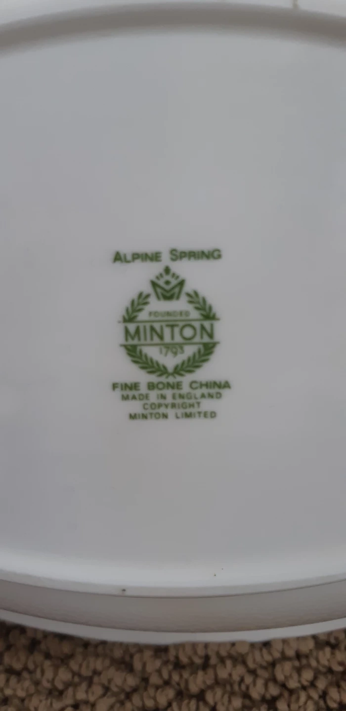 It's by Minton of England and has a delicate floral design with gold trim. Perfect for adding a touch of elegance to your table setting!