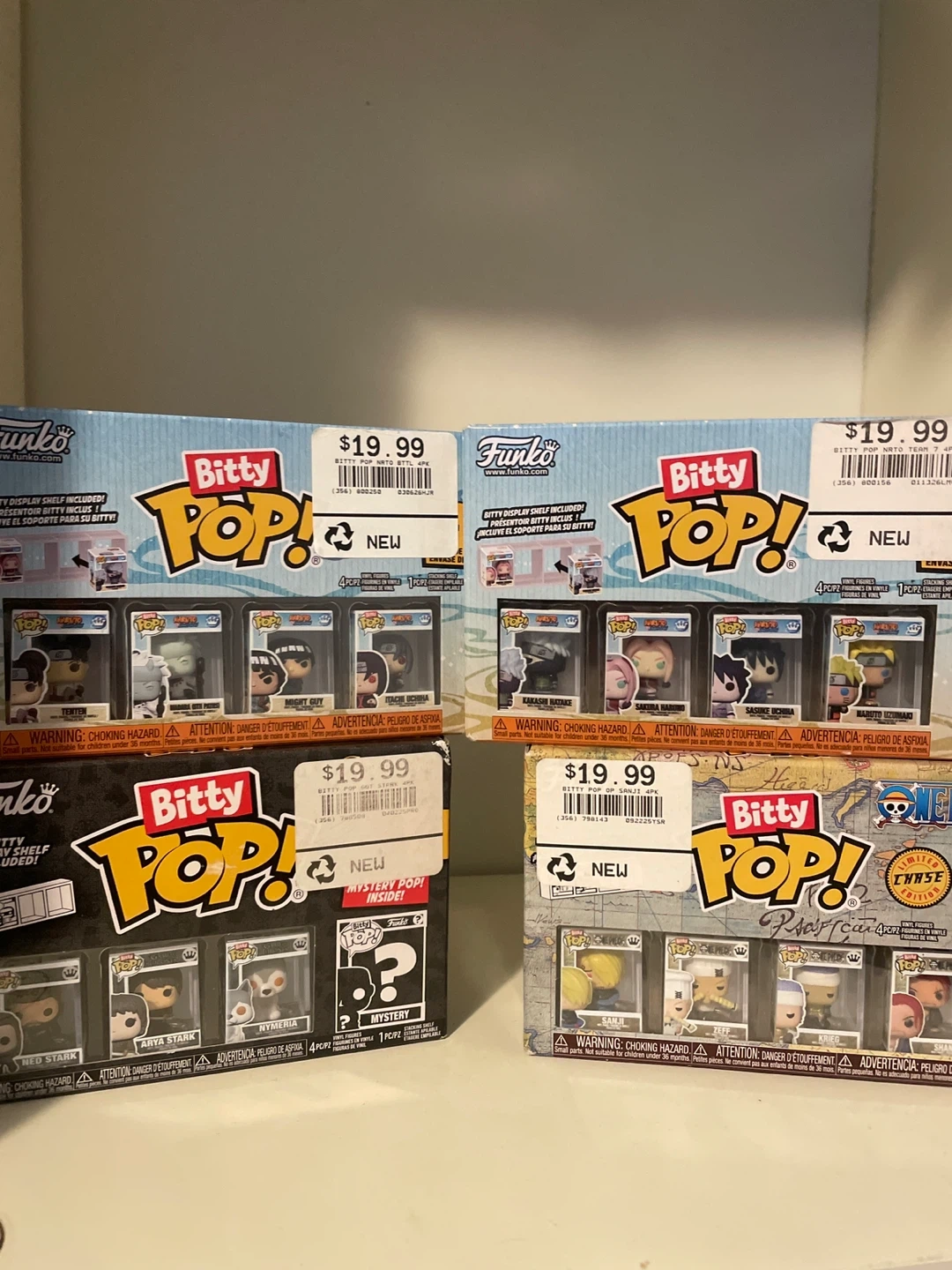 Funko Bitty Pop! figures include a display shelf. These collectible vinyl figures come in a mystery box, so you won't know which character you're getting! It's a fun surprise for any collector.