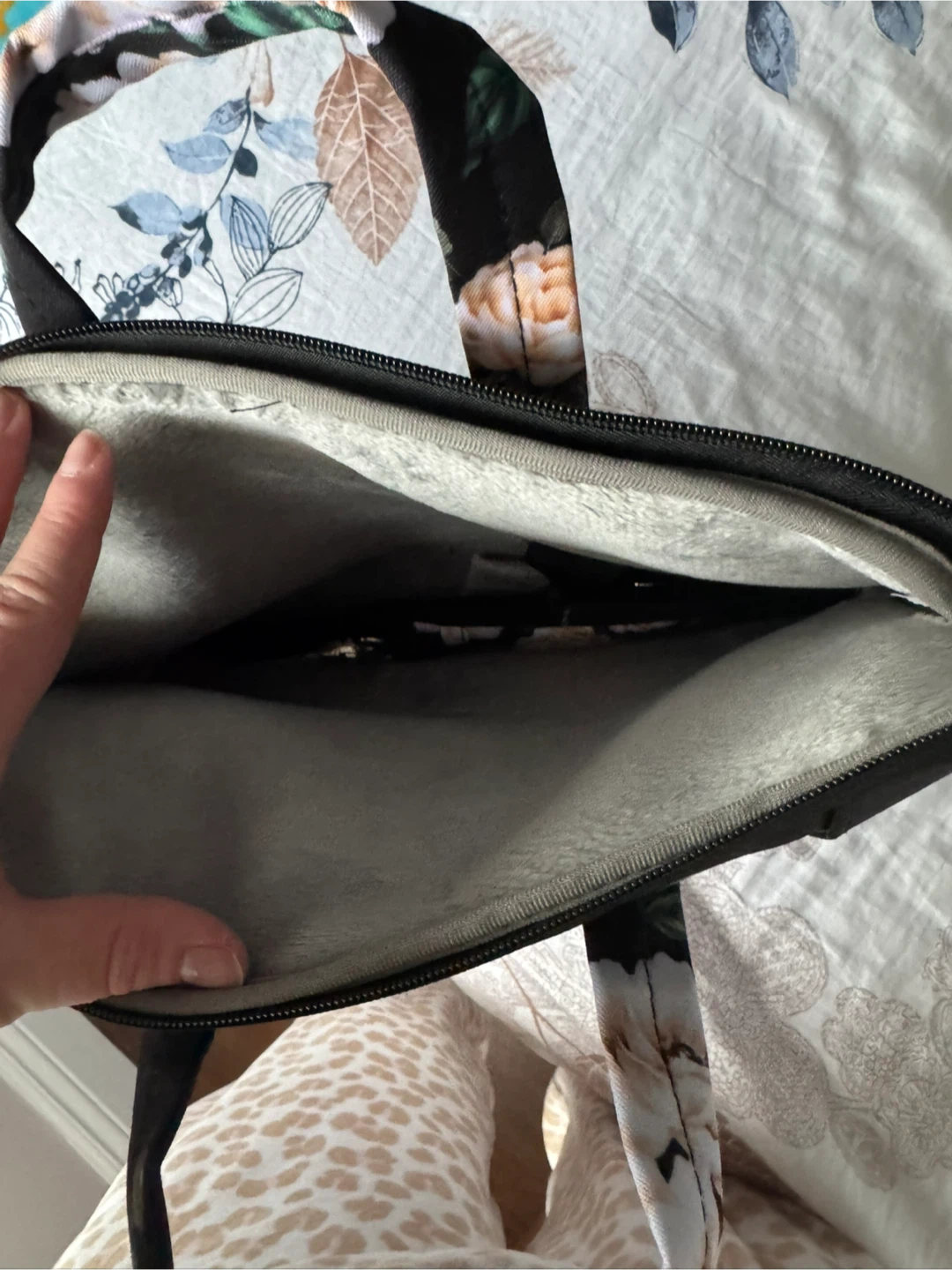 This Marso laptop bag features a beautiful floral print on a black background. It has padded interior lining for protection and sturdy handles for carrying. The interior is lined with soft grey material. Internal Dimensions: 15.35 x 0.79 x 11.22 inches / 39 x 2 x 28.5 cm (L x W x H); External Dimensions: 15.94 x 0.79 x 11.81 inches / 40.5 x 2 x 30 cm (L x W x H). The front horizontal side pocket dimensions: 11.02 x 10.83 inches / 28 x 27.5 cm (L x W). The back vertical side pocket dimensions: 10.43 x 11.22 inches / 26.5 x 28.5 cm (L x W).