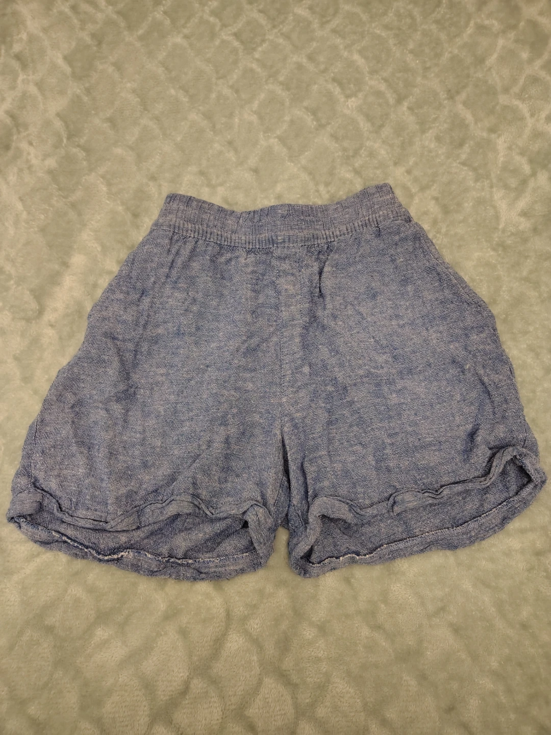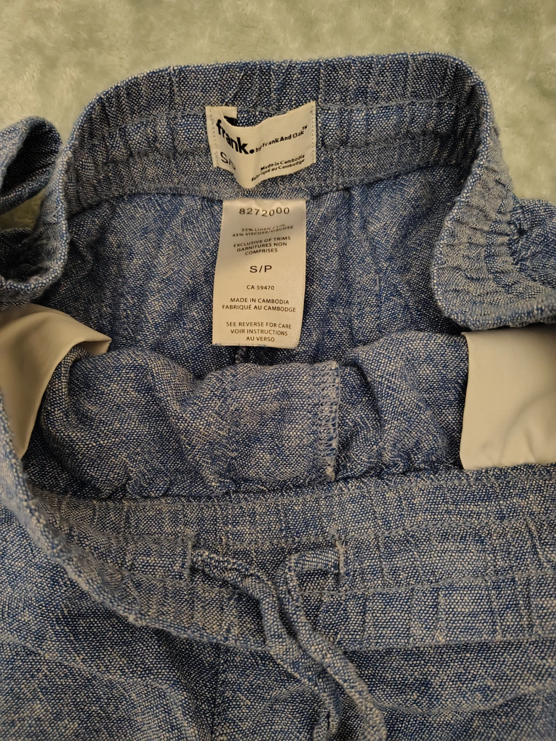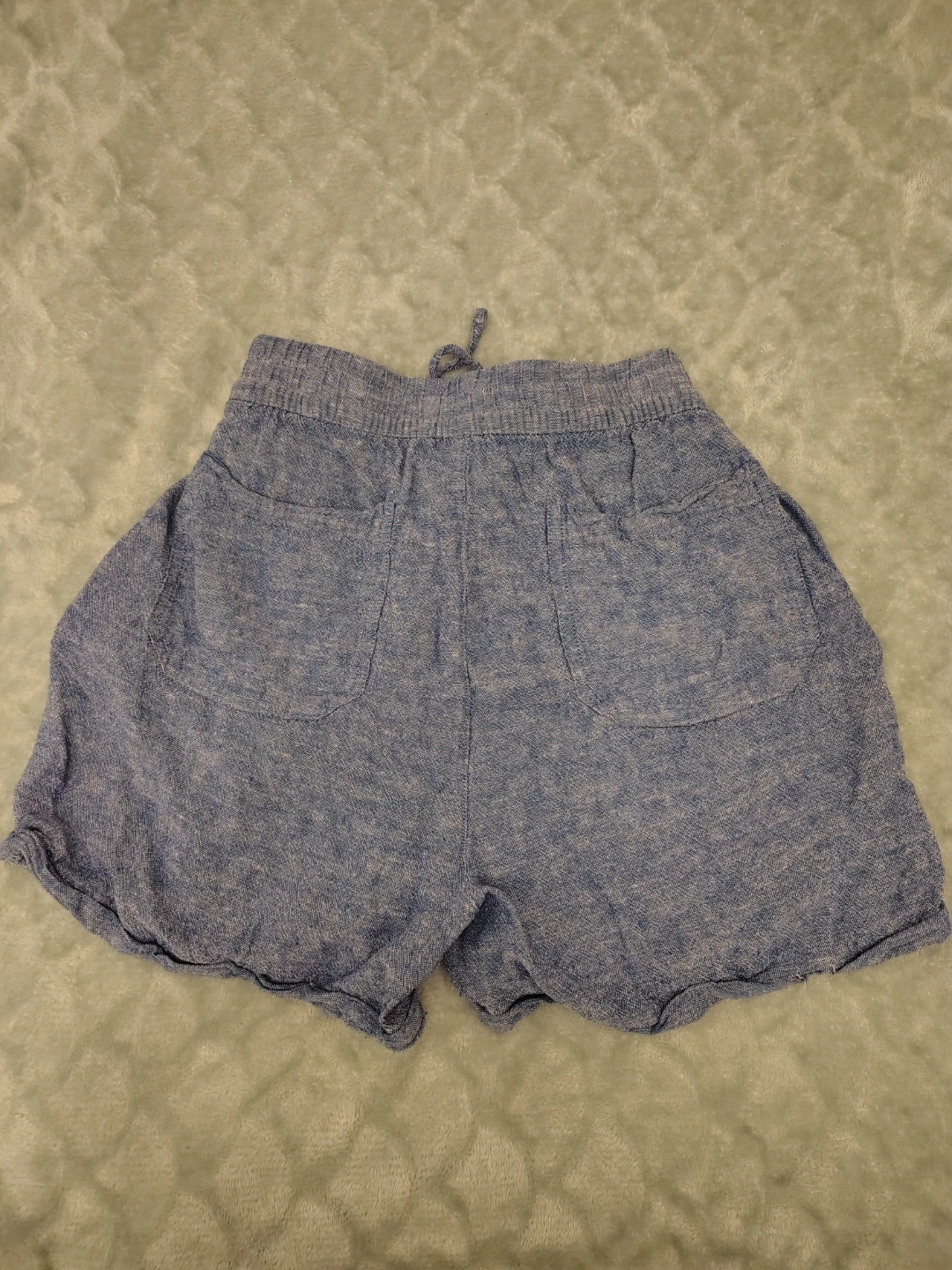 Light blue shorts made from a linen and viscose blend. They feature an elastic waistband with a drawstring and two front pockets. Size S/P.