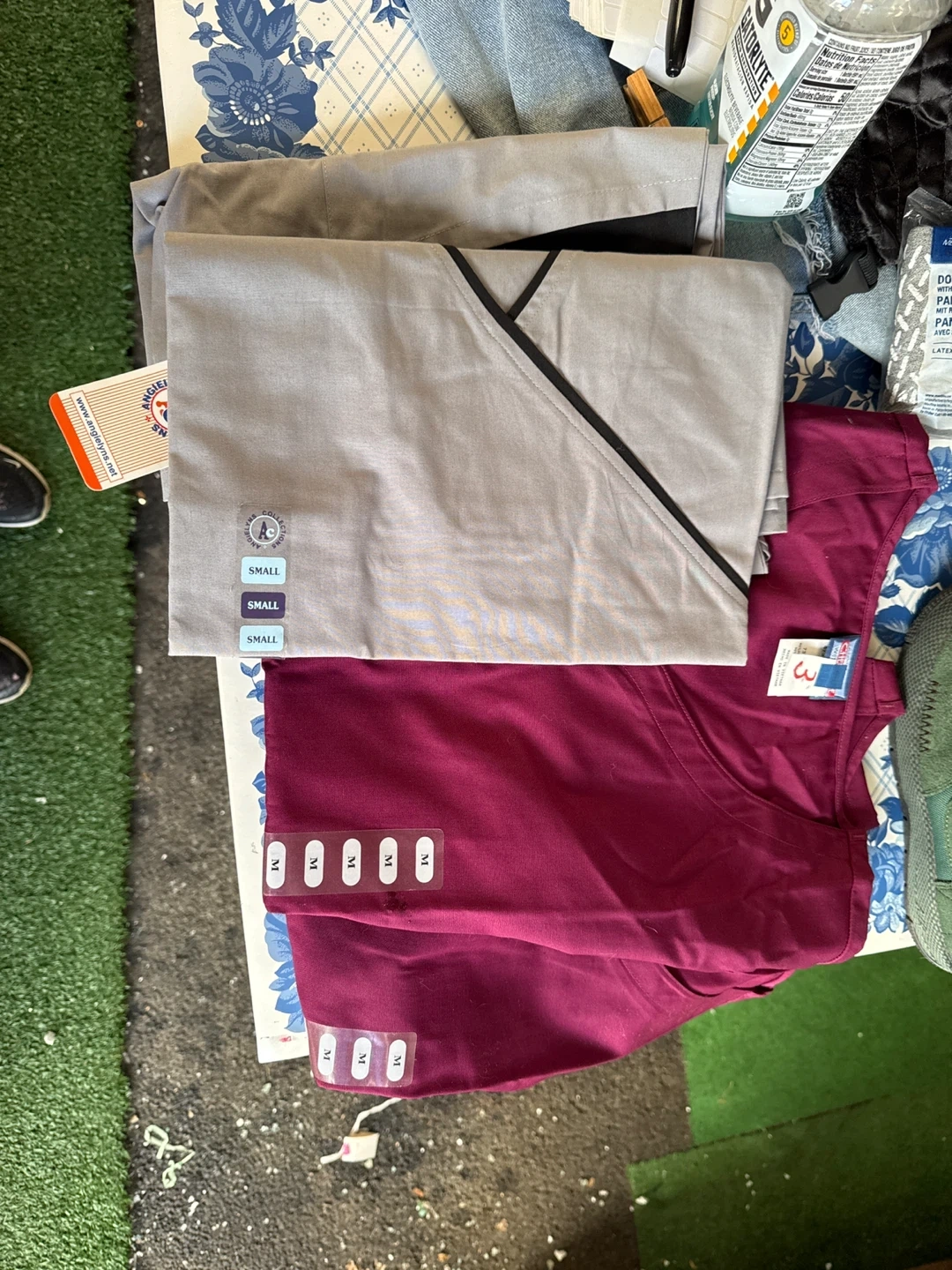 Brand new Angie LYN'S scrub top in a size small and gray color and size medium burgundy. This top has a black trim detail. Another scrub top is also included, size medium and burgundy. All 4 are new with tags!