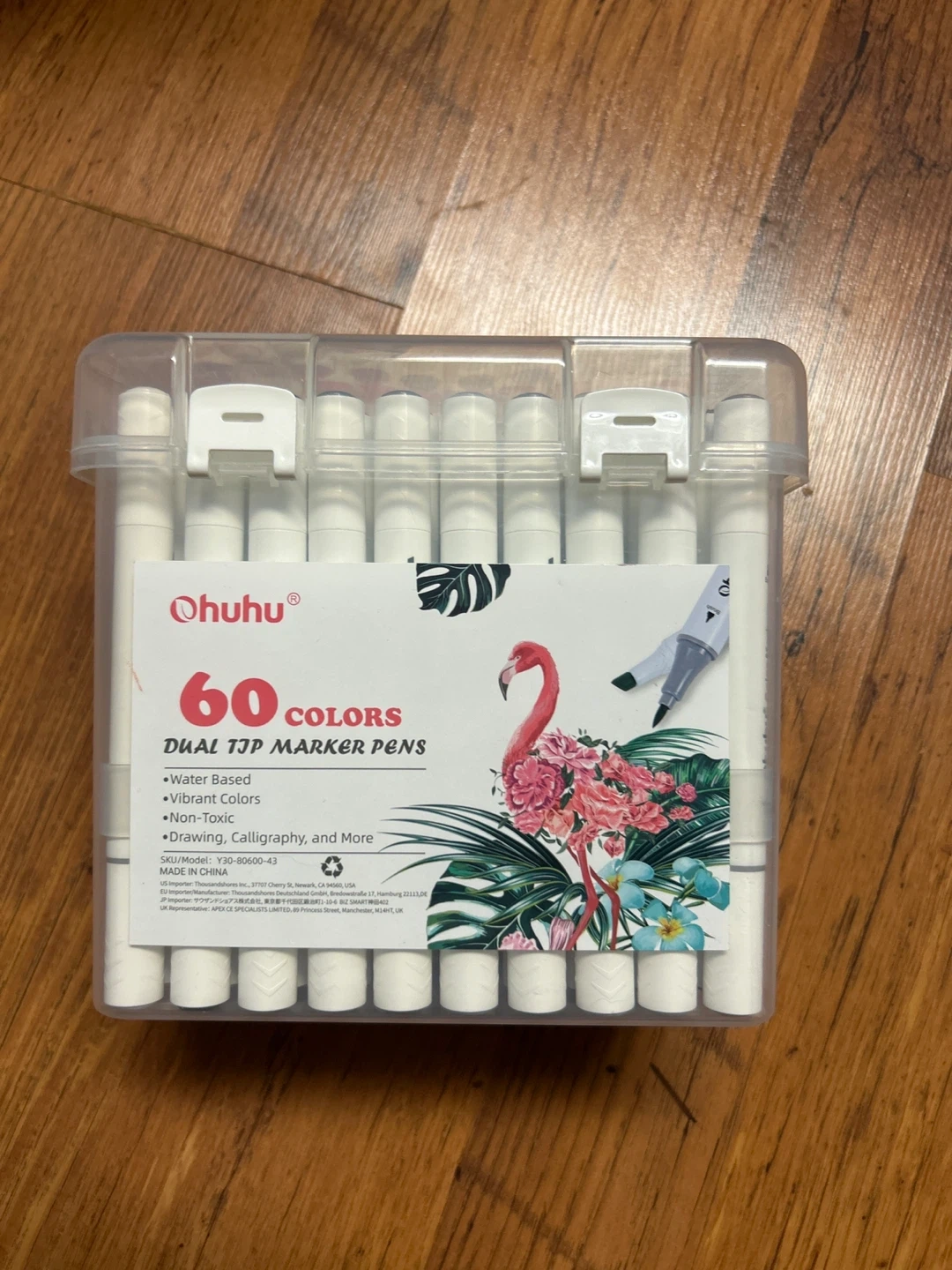 Set of 60 dual tip marker pens by Ohuhu. Features water-based, vibrant colours suitable for drawing, calligraphy, and more. Includes a portable plastic case for storage.