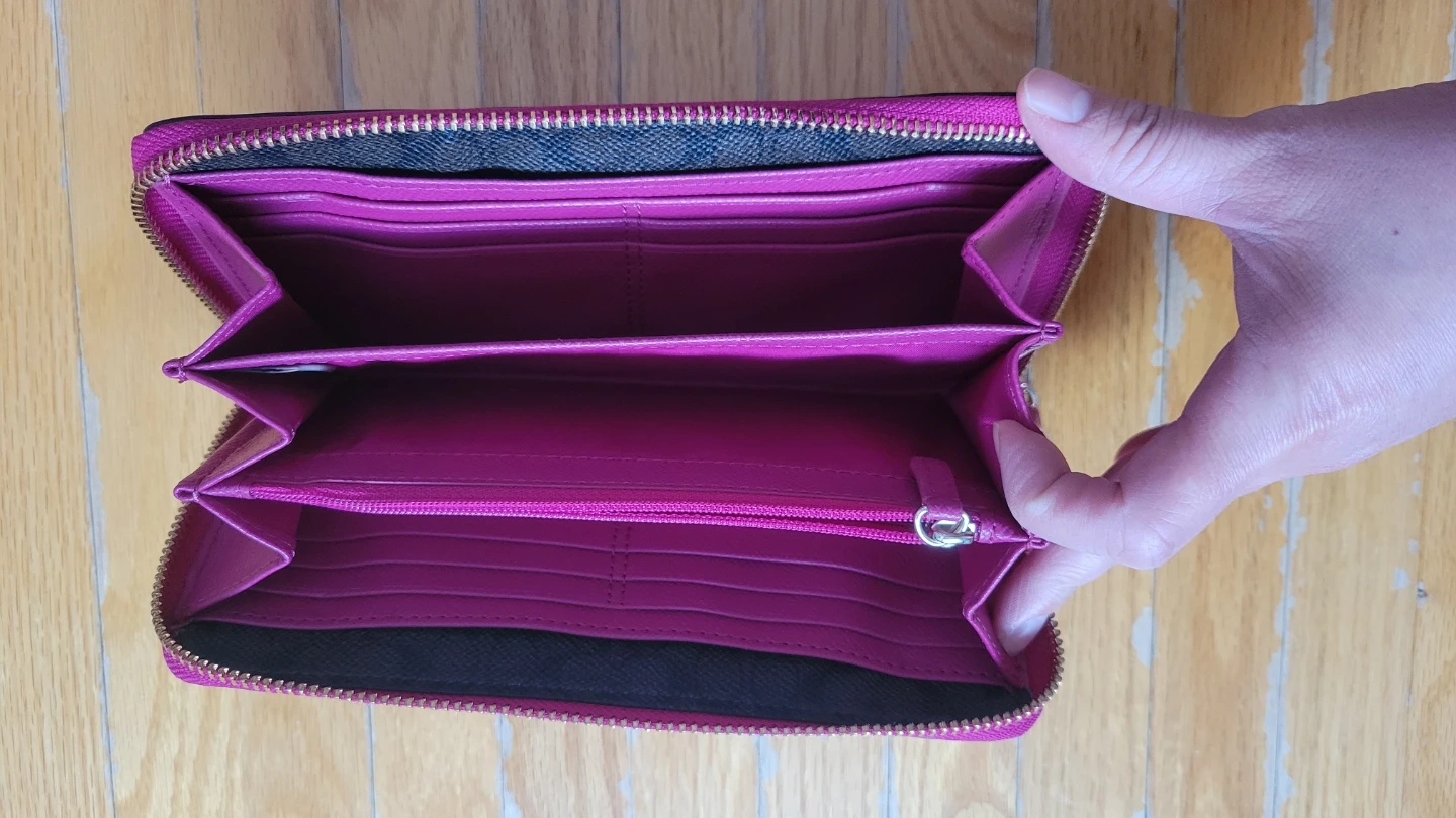 It's a stylish pink zip-around wallet from Coach. The interior features multiple card slots and compartments for organization. Made from durable leather. Brand new, never been used.
