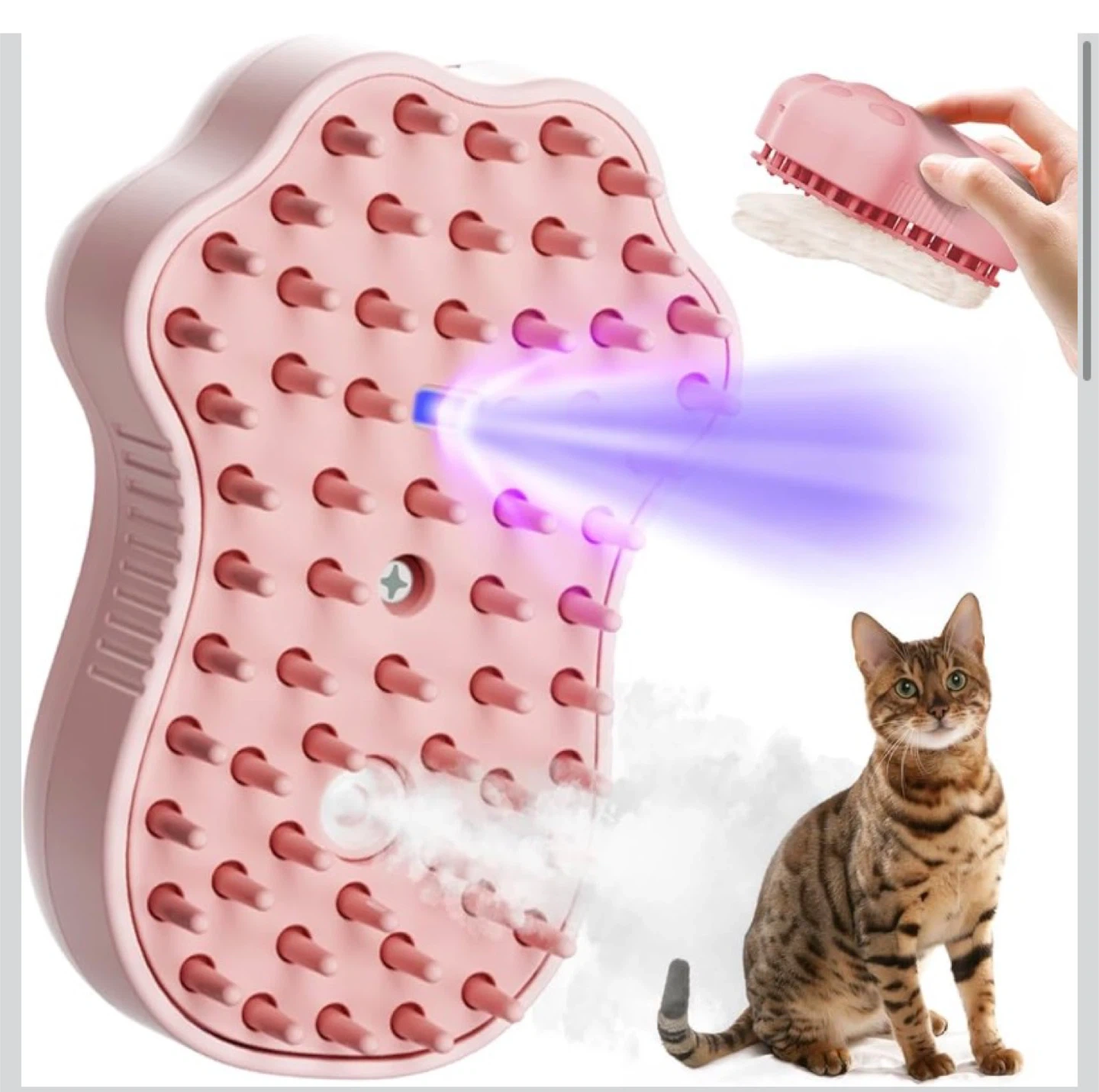 This is the Steamy Brush pet groomer. It helps remove loose hair and can be used for cleaning and massaging your pet. It's made with pet-friendly soft silicone brush head.