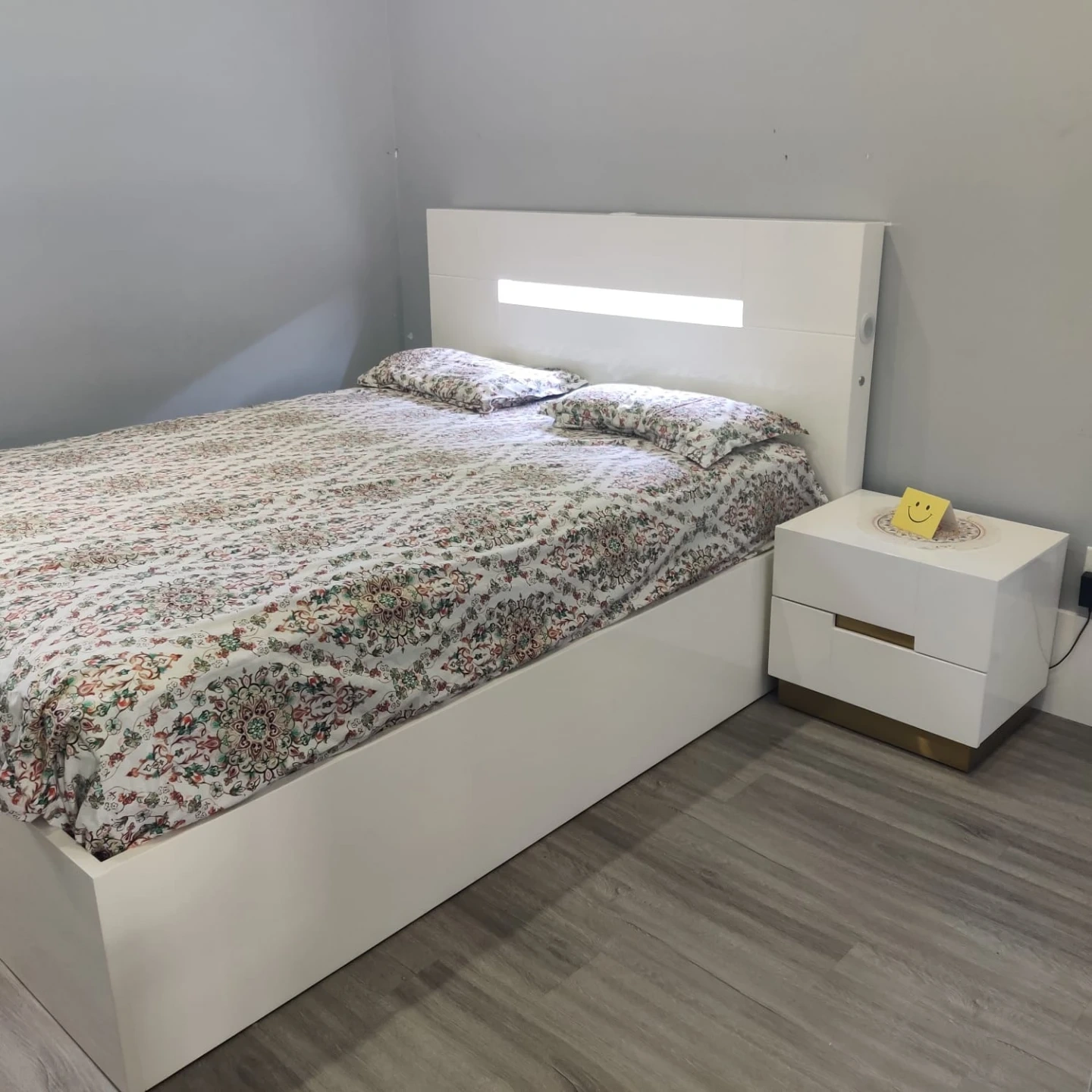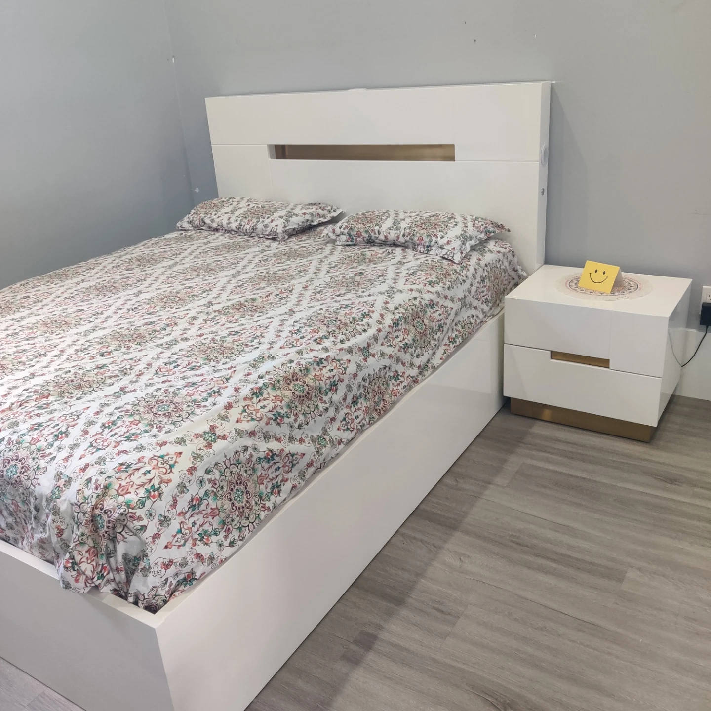 This is a queen-size bed frame with a modern design and convenient built-in storage underneath. It features a sturdy headboard and a lifting mechanism that provides easy access to the storage compartments. The Sealy Hollycourt mattress (from Costco) with medium firmness is also included along with a matching side table.
