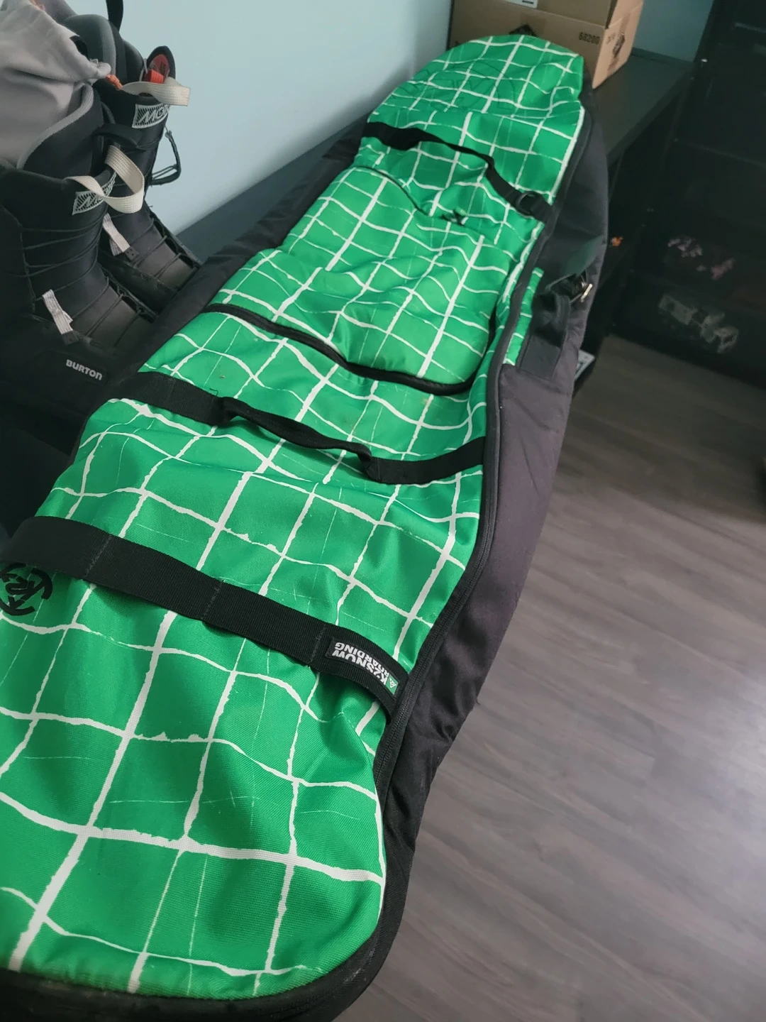 Burton snowboard boots (size 8). Spy goggles. K2 Green snowboard bag. Great for hitting the slopes! Boots are black with white accents. Goggles have a reflective lens. 🏂