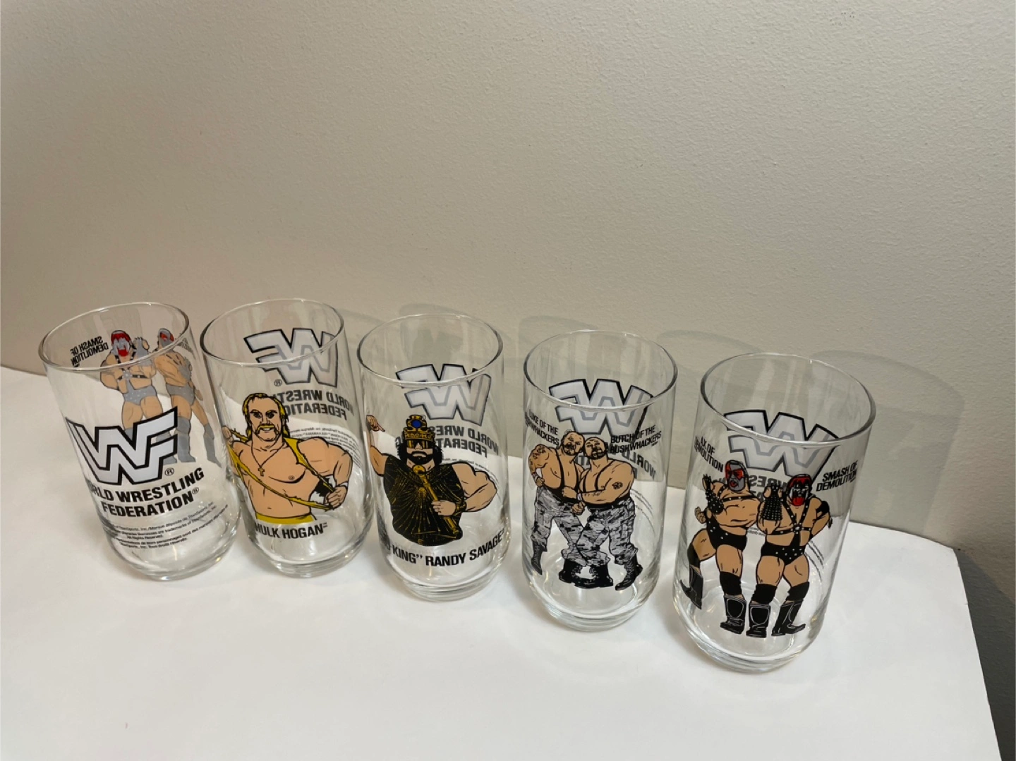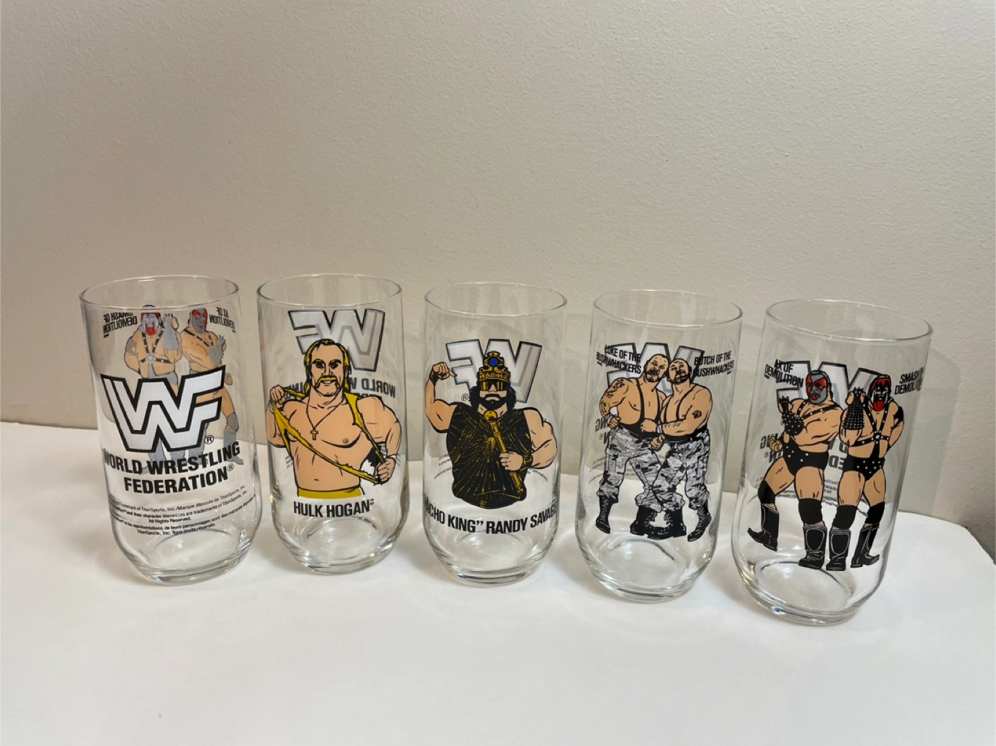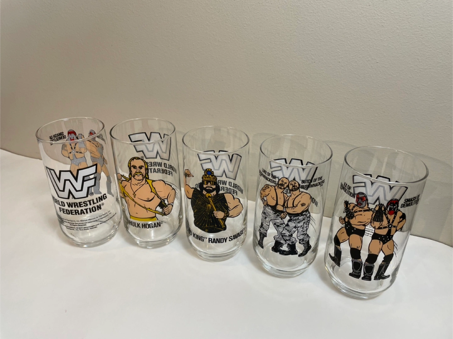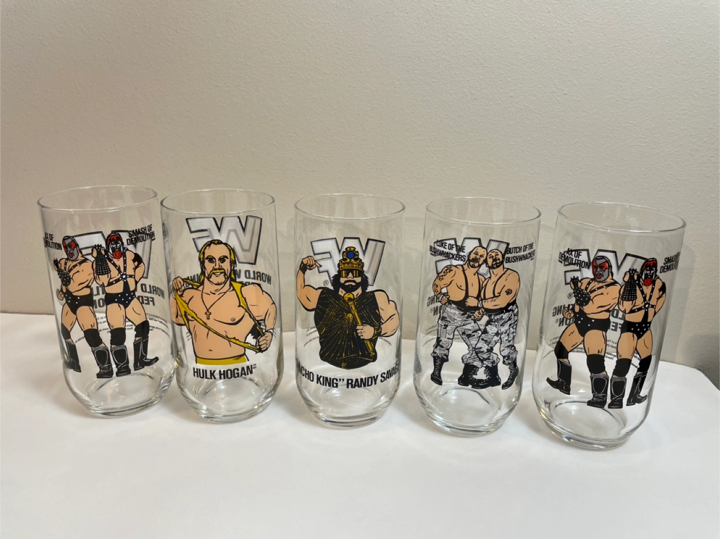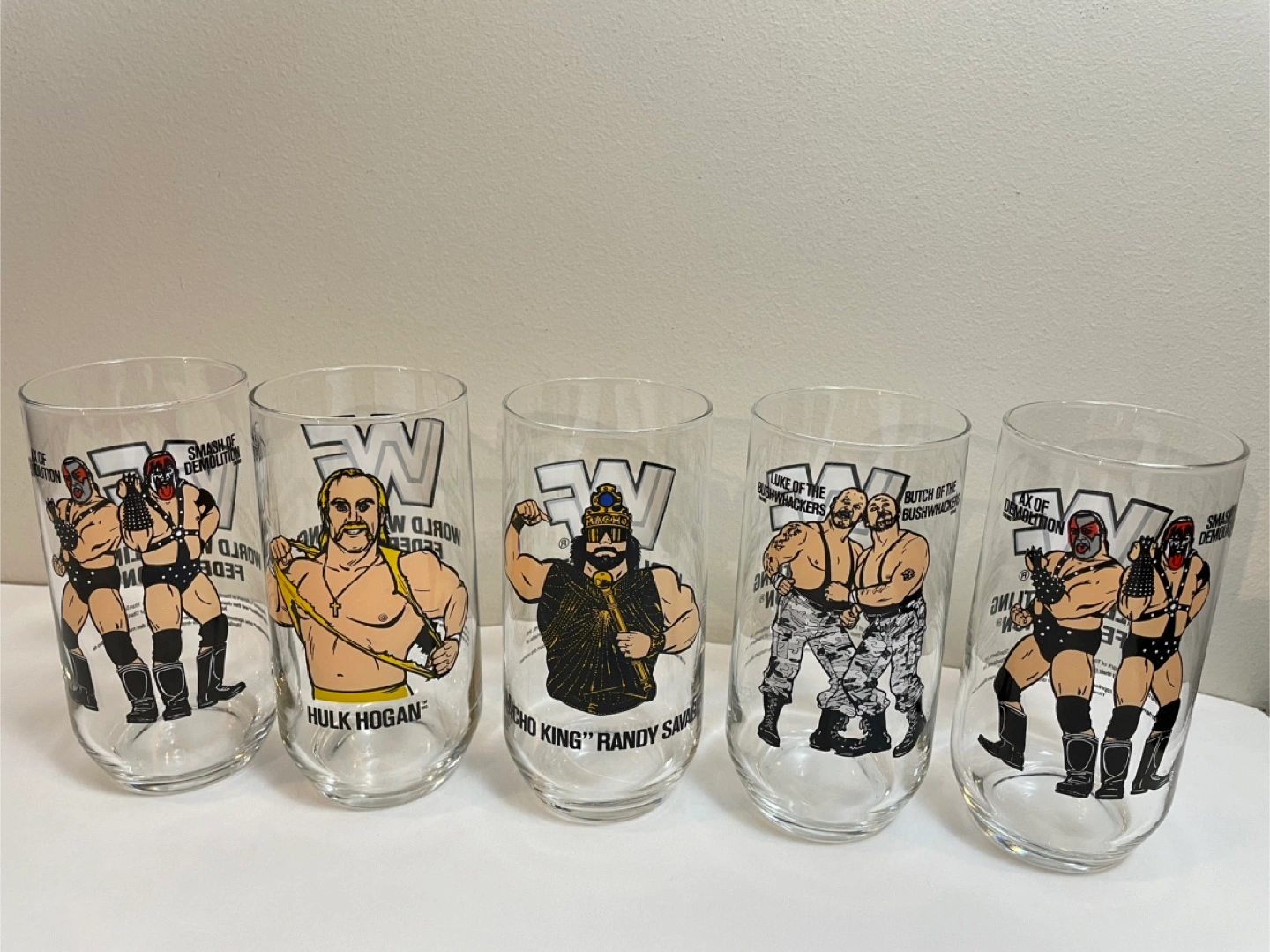 Selling a set of 5 collectible WWF glasses! Each glass features a different wrestler: Smash & Demolition, Hulk Hogan, Macho King Randy Savage, Butch & Luke of the Bushwhackers, and Smash & Demolition again. Great for any wrestling fan! Sold as a lot .