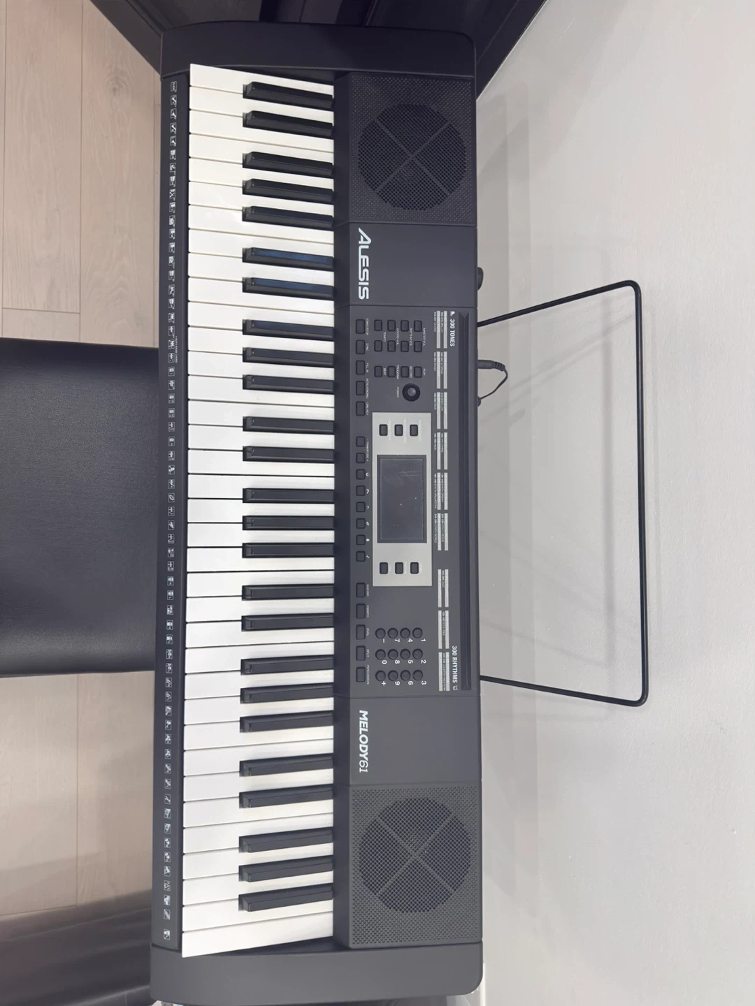 This is an Alesis Melody 61 keyboard, perfect for beginners or aspiring musicians. It features 61 keys and built-in speakers for immediate play. The keyboard comes with a music stand and includes a power adapter.