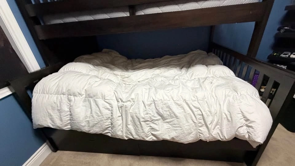 No damage, no squeaks, just switching up the room. Bottom mattress is a double (not included), top is a twin — I can throw in the top twin mattress for +$75 if you want it.