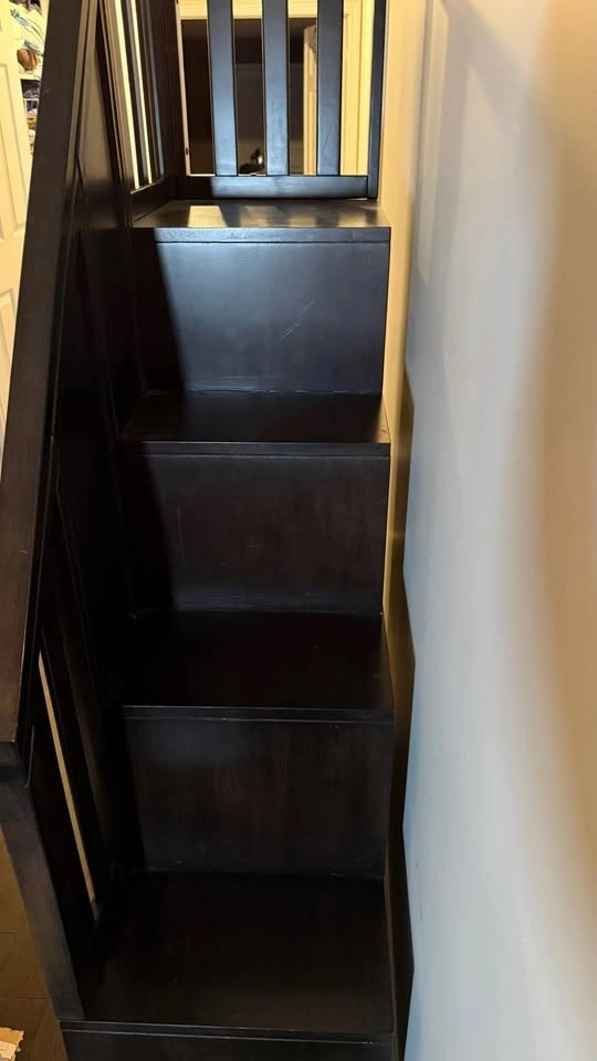 Solid wood bunk bed in great shape, super sturdy, dark espresso finish, built-in storage drawers and matching stair unit (stairs can be attached or left detached for transport).