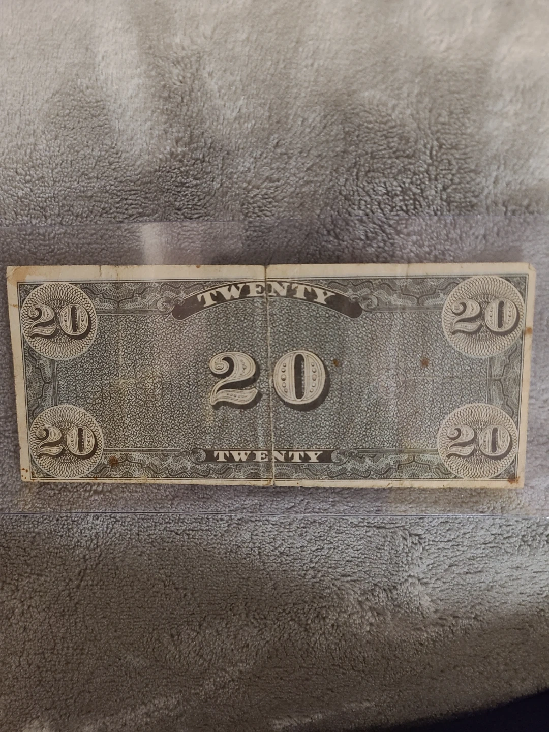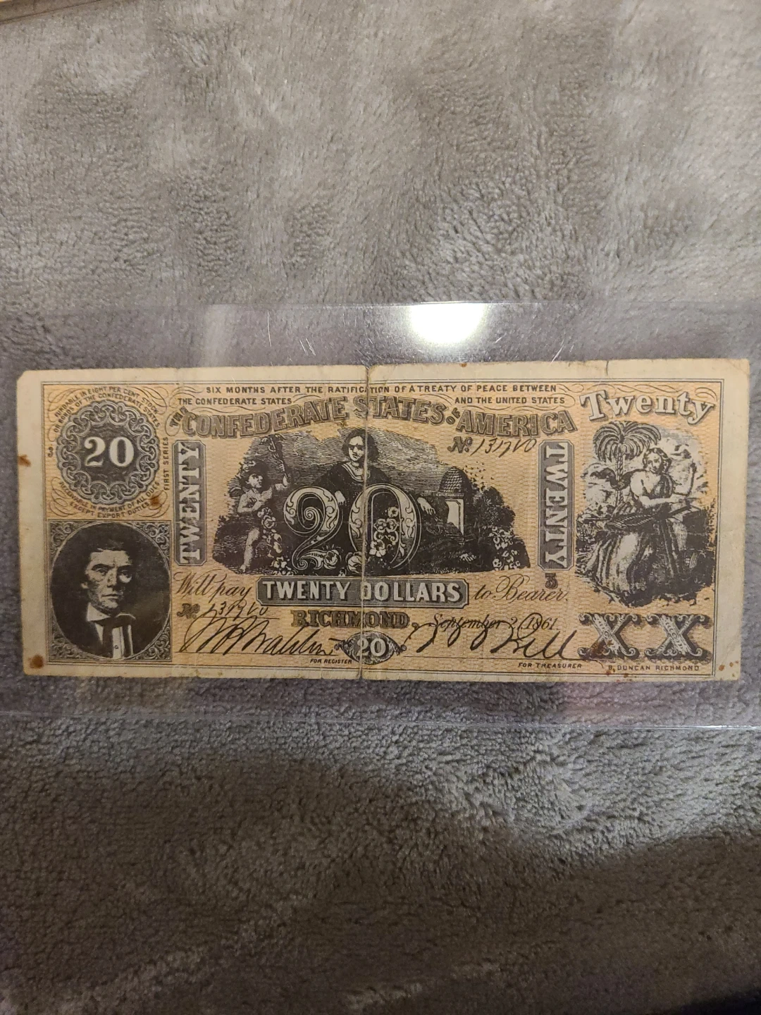 This is a vintage 20 dollar note from the Confederate States of America, dated September 2 1861. It features intricate historical designs and text indicating it's payable six months after the ratification of a treaty of peace. This note would be of interest to collectors of historical currency or Americana.