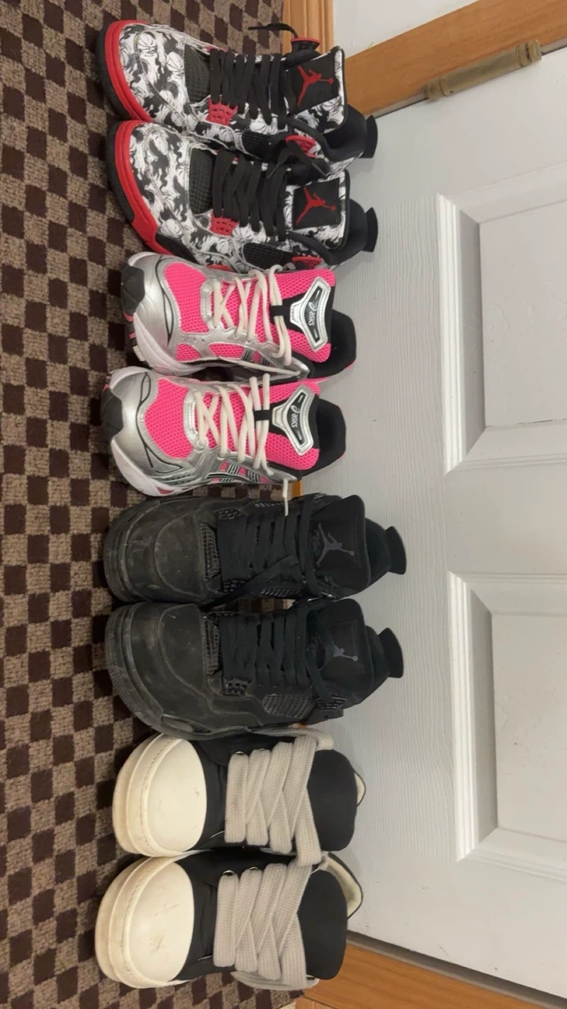Collection of sneakers including Air Jordan 4 style, Asics running shoes, and Rick Owens. Selling as a lot.