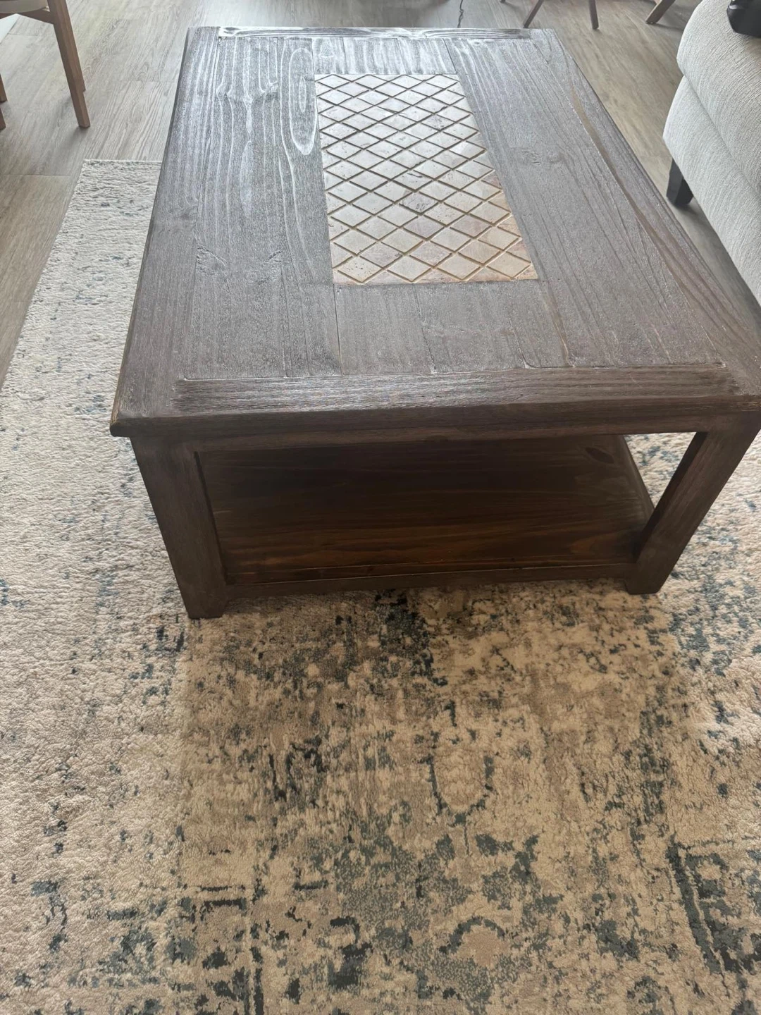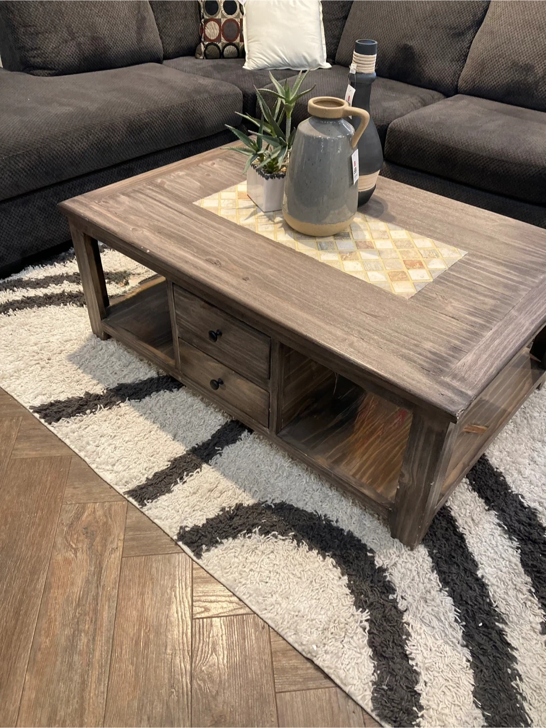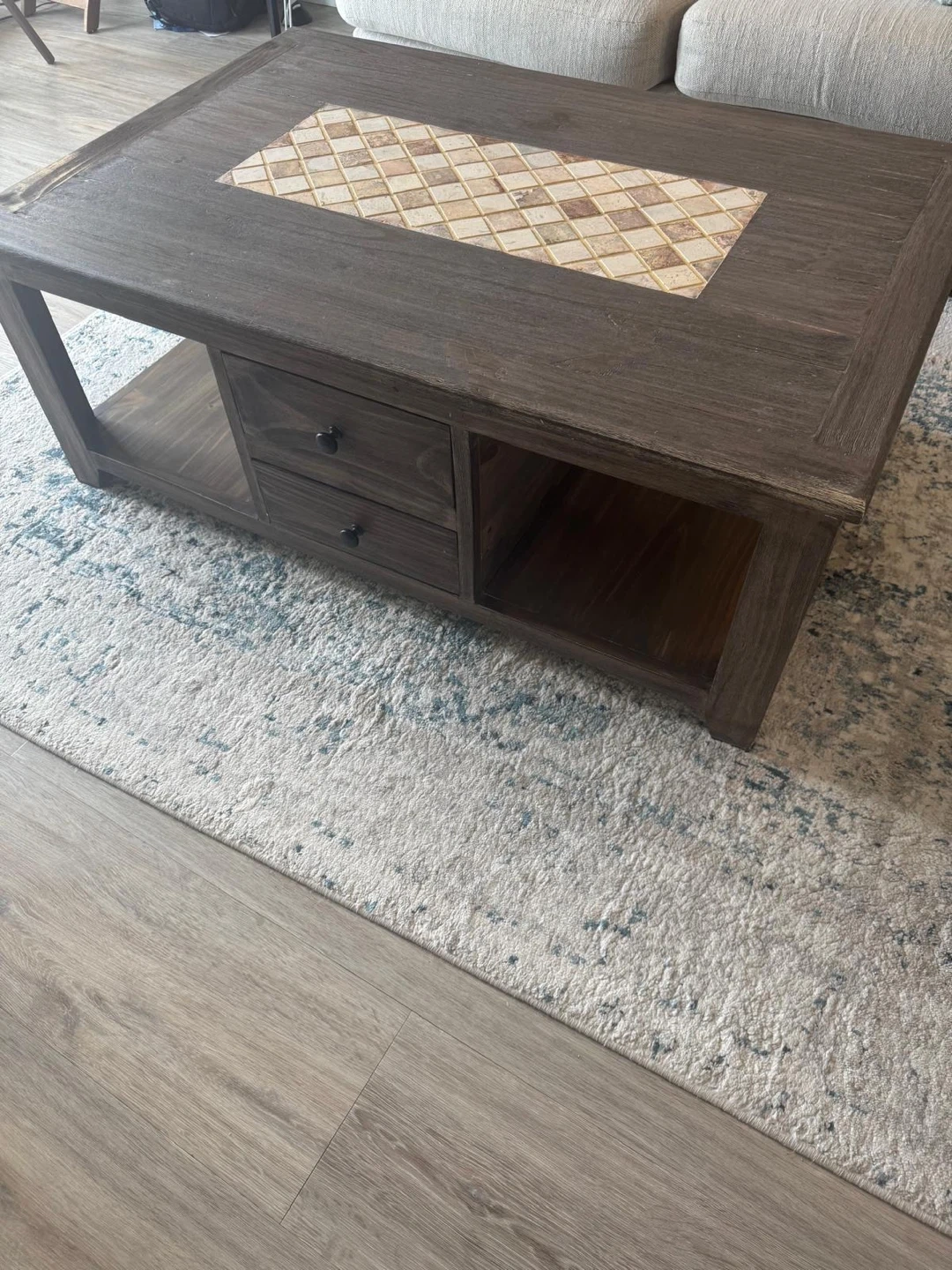 A dark wood coffee table featuring a decorative tiled inlay on the top surface. It includes two drawers for storage and an open shelf below. This table would be great for a living room or family room!
