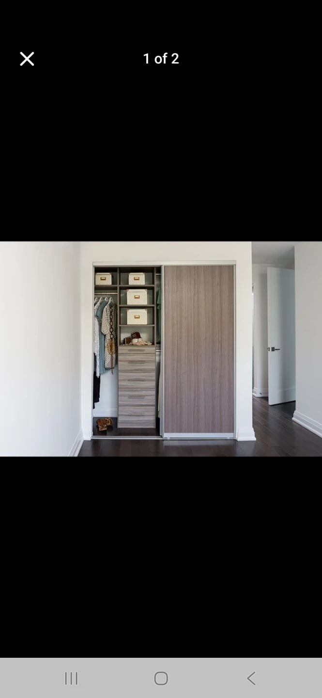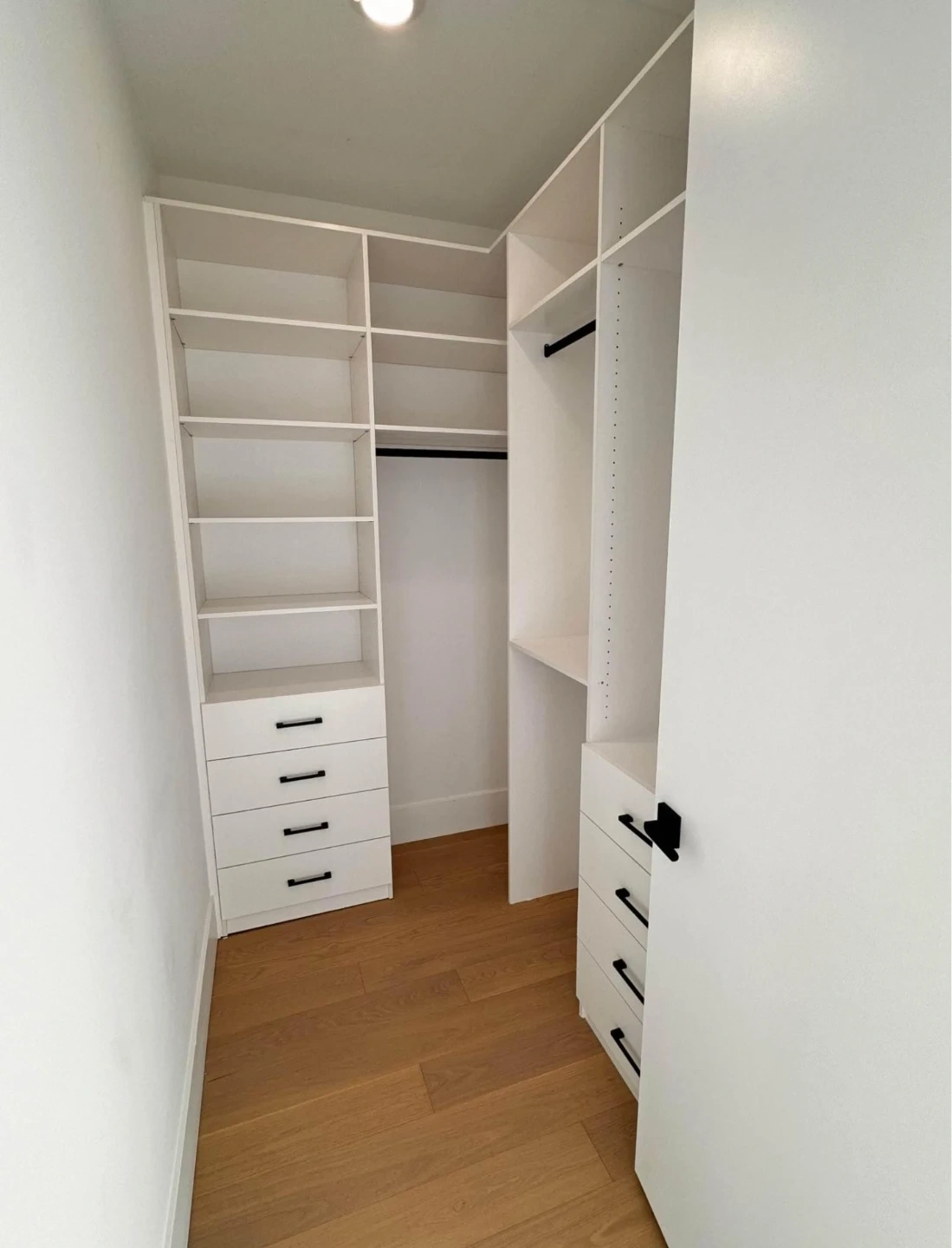 This closet system offers ample storage with multiple shelves and drawers. It's designed to maximize space and keep your belongings tidy. Perfect for organizing clothes, accessories, and more!