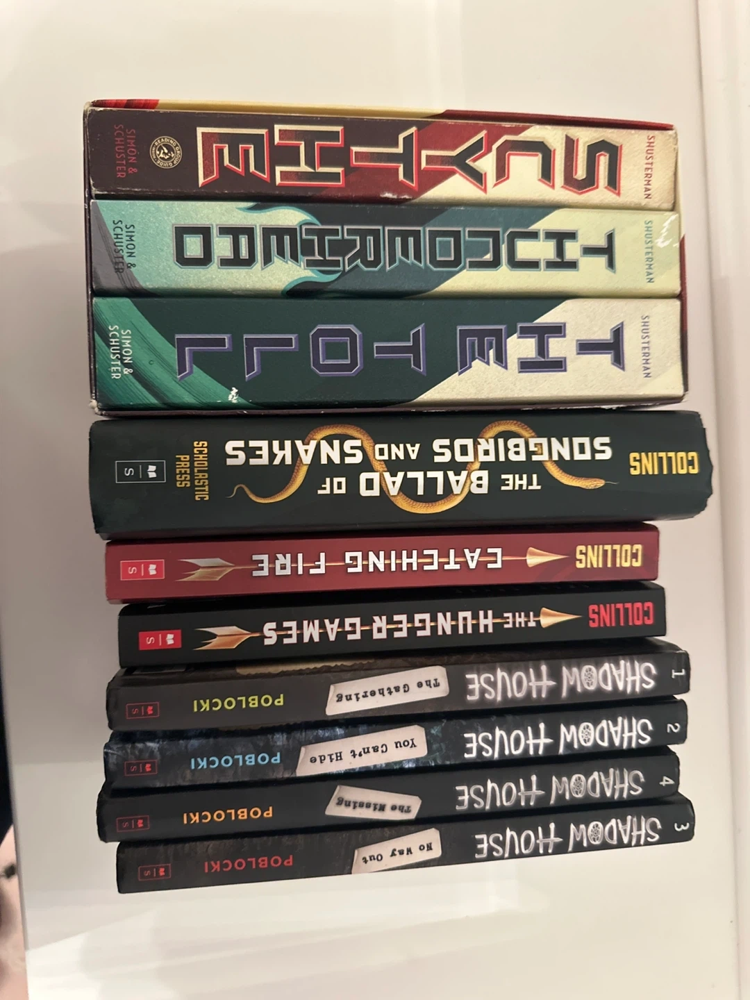 Bundle includes The Hunger Games trilogy by Suzanne Collins and the Arc of a Scythe series by Neal Shusterman. Also includes Shadow House series by Dan Poblocki. Perfect for young adult readers!
