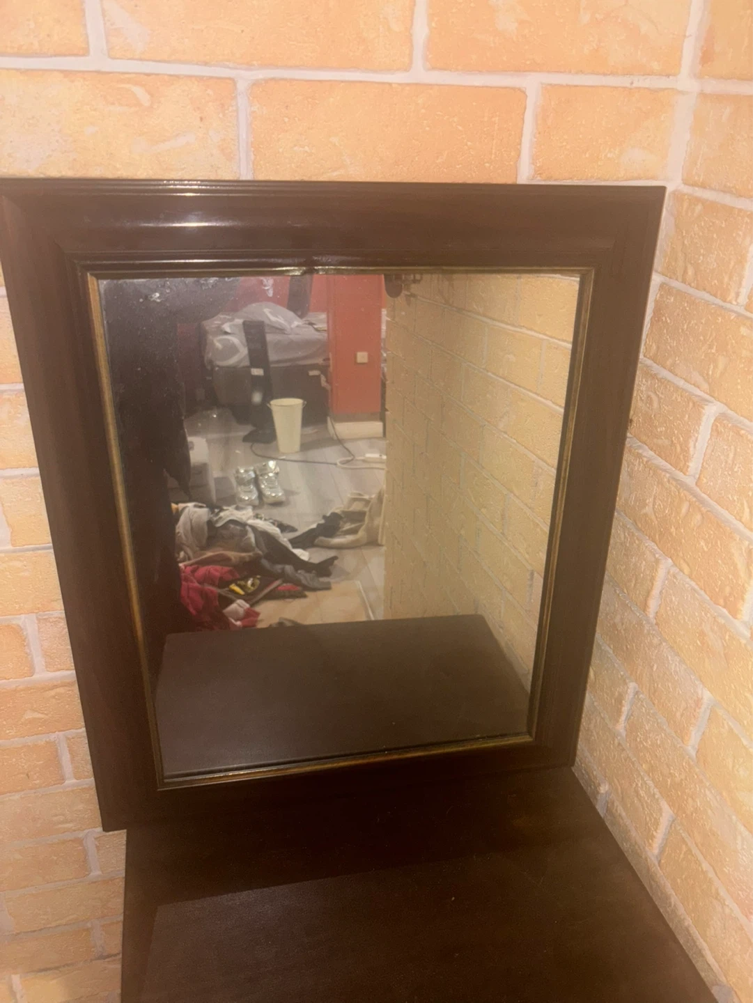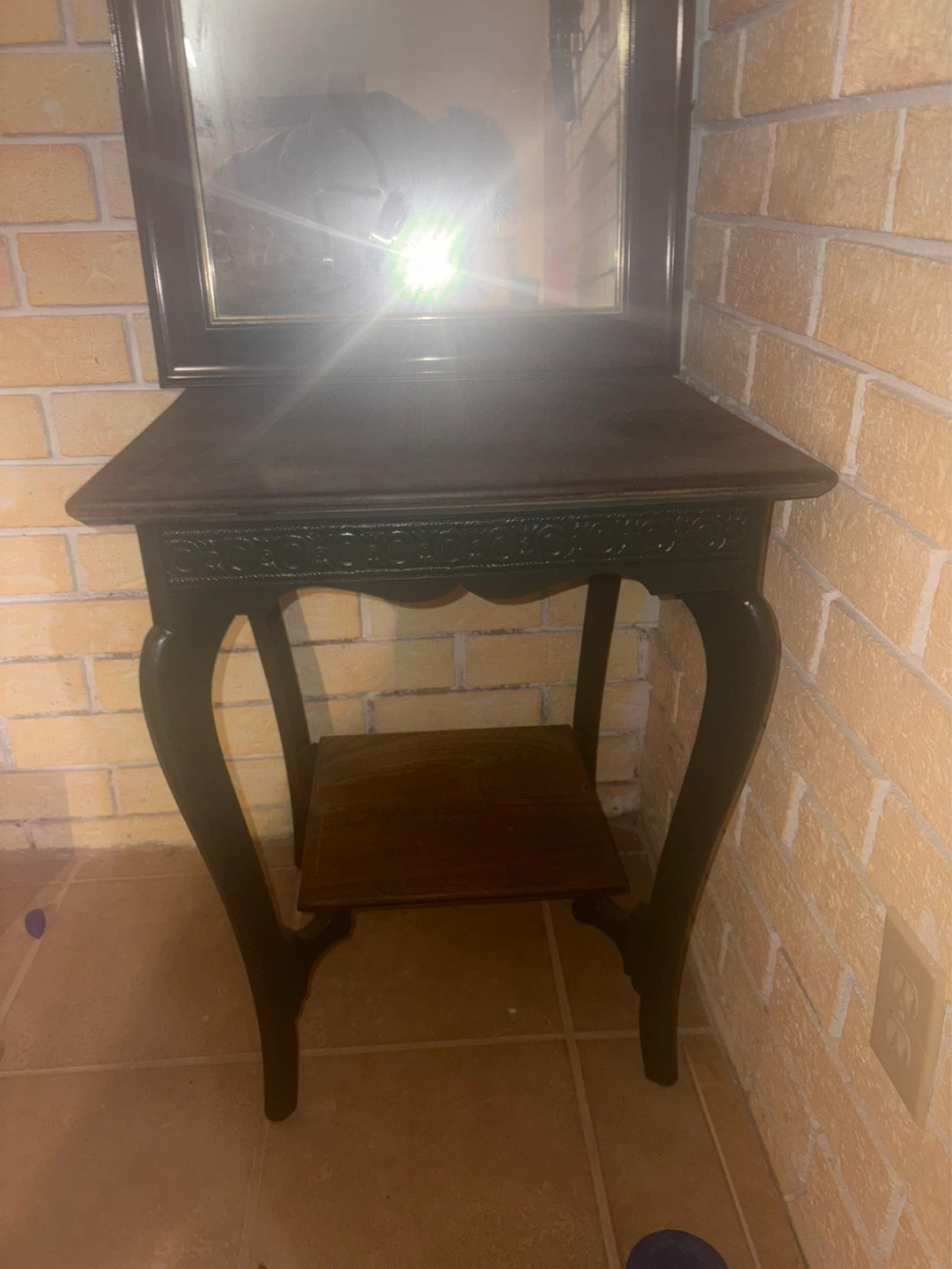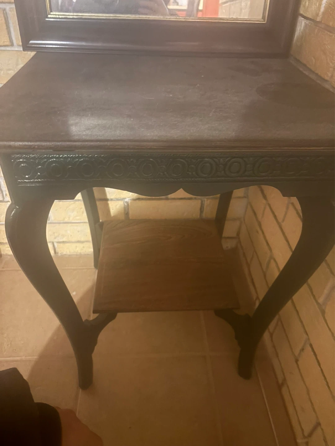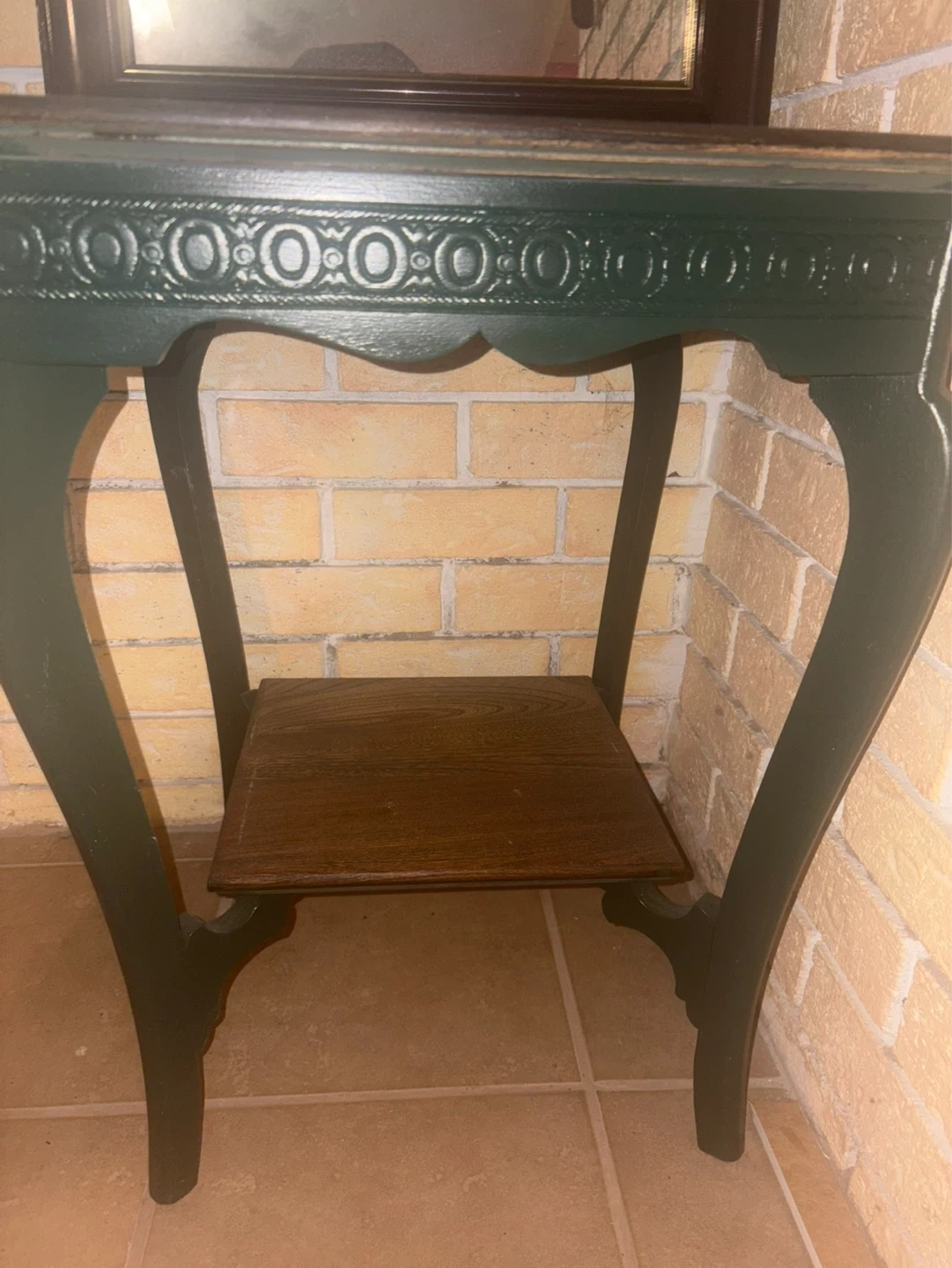 This accent table features a dark green painted finish with a lower shelf for extra storage. It includes a decorative carved edge detail. A matching dark wood framed mirror sits atop the table. Perfect for an entryway or small space!
