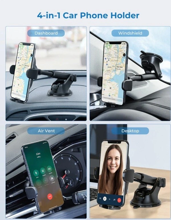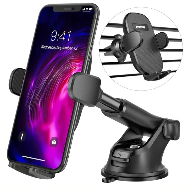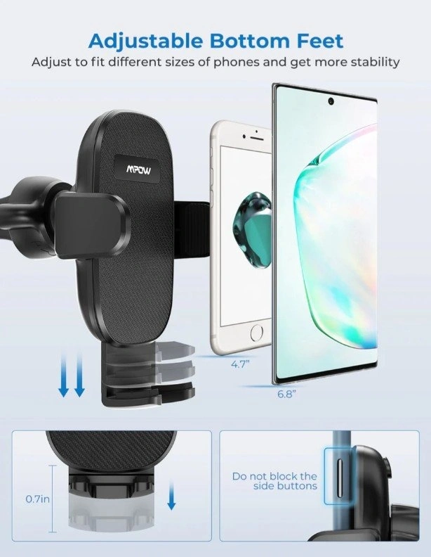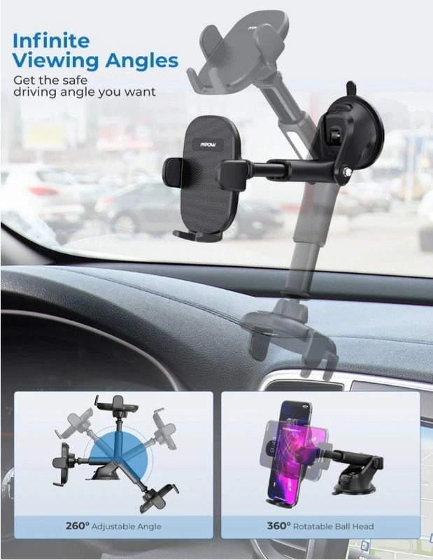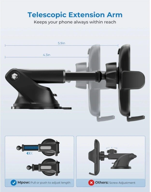 This Mpow 155A car phone mount offers multiple mounting options: use the air vent clip or the suction cup on your windshield or dashboard. The vent clip has a twist-lock system for a secure fit on various air vent types and stays stable even on bumpy roads. It fits phones with 4.0-6.8 inch displays, up to 3.5 inches wide, and includes an adjustable bottom foot. A quick-release button lets you mount and remove your phone easily. The strong suction cup uses sticky gel for a tight hold on flat surfaces and has a 2-step locking lever for extra support. If the gel loses grip, just wash and dry it to restore stickiness. The mount features a telescopic arm that extends from 4.3 to 5.9 inches, with a 260° pivot and a 360° ball joint for perfect viewing angles in portrait or landscape mode.