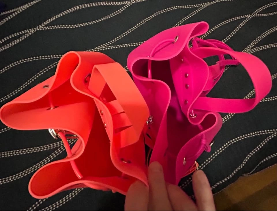 I have two beautiful brand new American Jewel silicone gummy bucket backpacks for sale. They measure about 12 1/2 inches tall with a drawstring closure. Easy to clean since they are rubber! Both are new and never used.