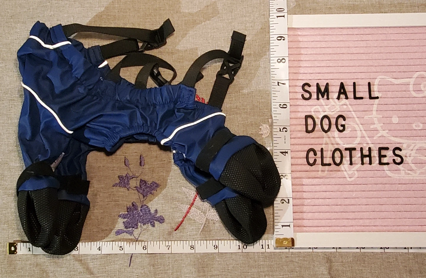 This XS navy blue dog snowsuit features integrated boots for full coverage. It's designed for small dogs and has adjustable straps for a secure fit. Reflective trim for visibility.
