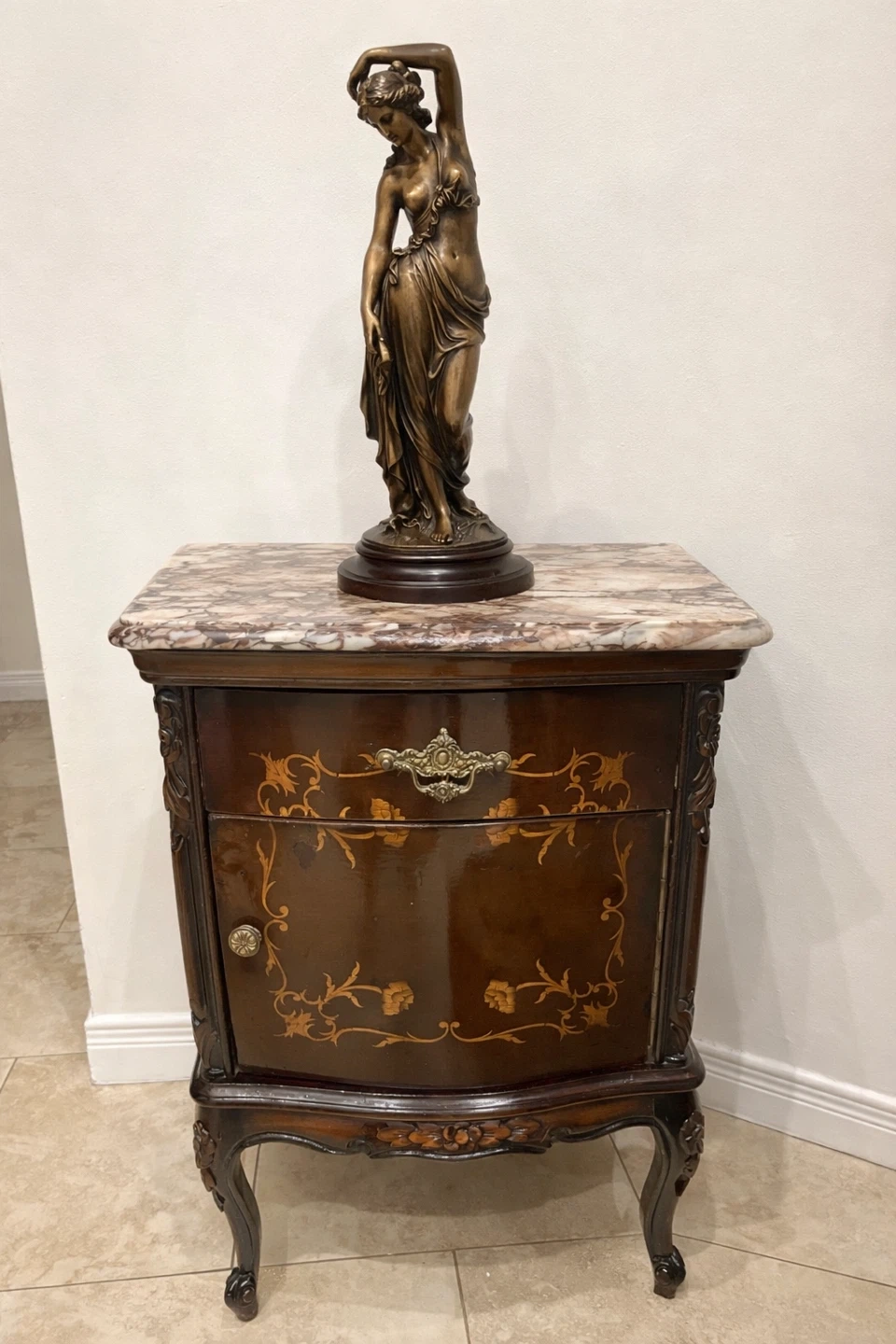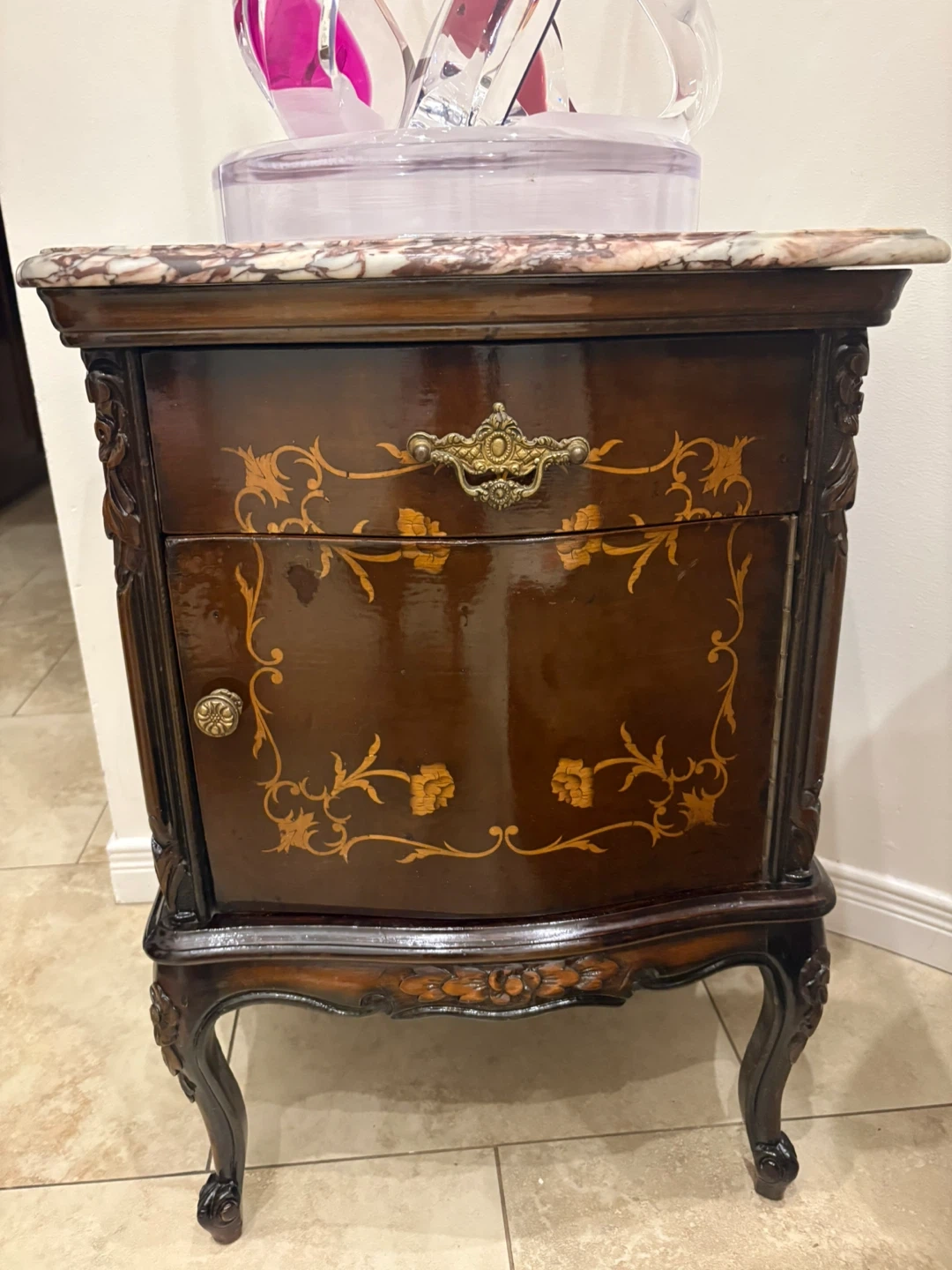 This is a classic nightstand with a beautiful marble top. It features intricate wood inlay detailing on the drawer and door fronts. The ornate hardware and carved legs add to its vintage charm. It's a stylish addition to any bedroom!