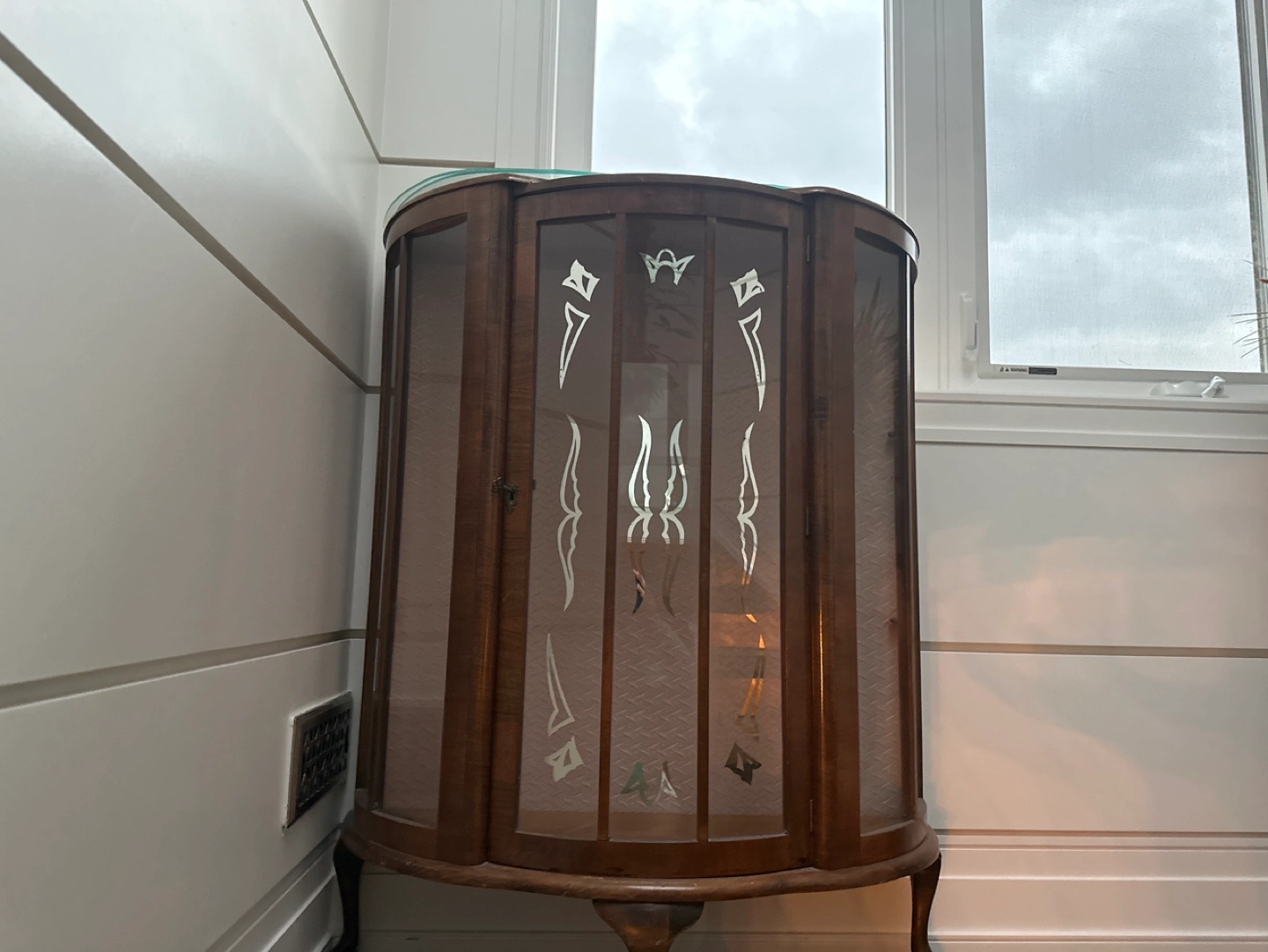 Beautiful vintage corner curio cabinet. Features glass doors and decorative accents. Has a curved design. Perfect for displaying collectibles.