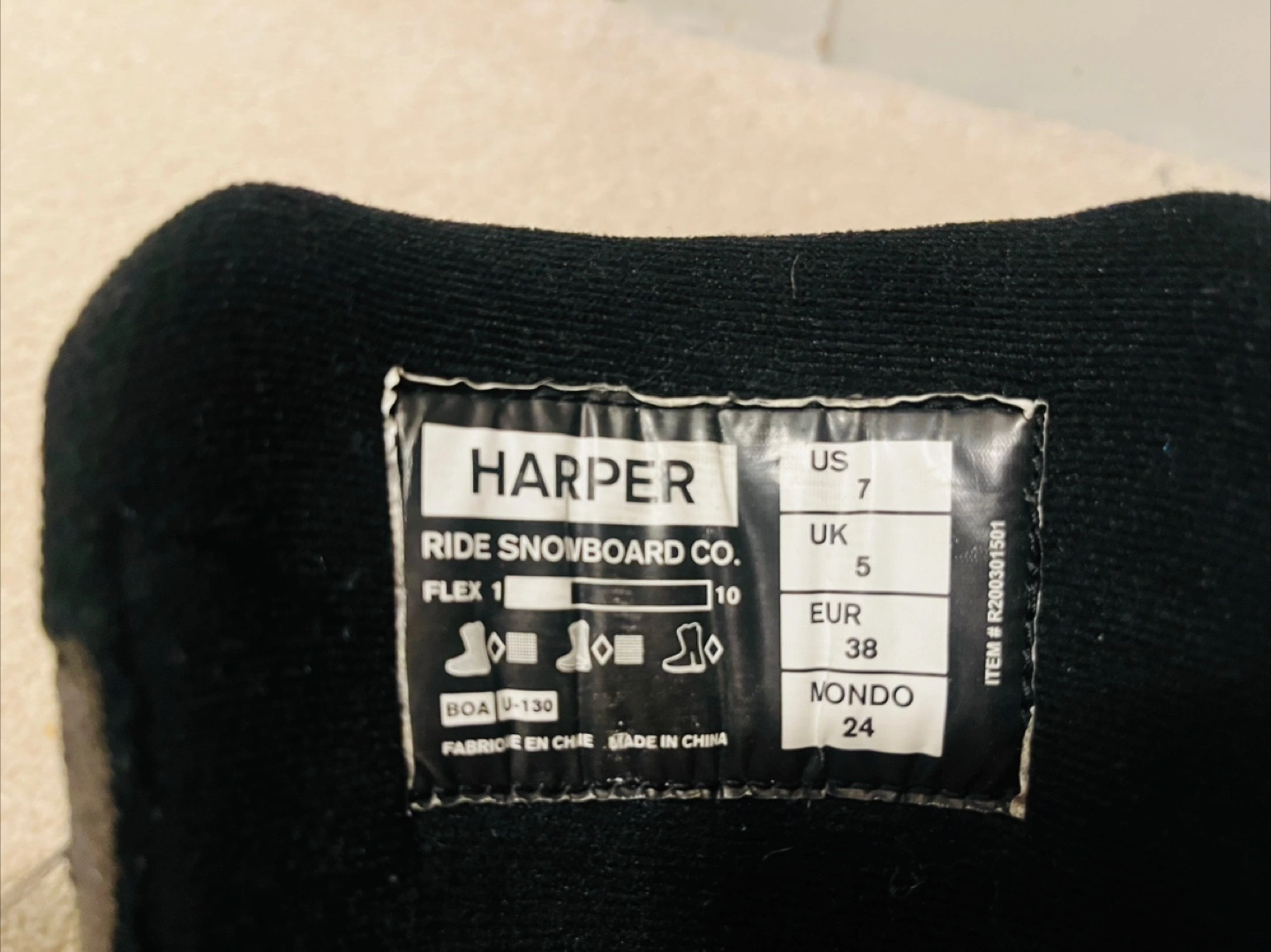 Women's Ride Harper snowboard boots. Size US 7, UK 5, EUR 38. Boa system. Black leather-like material. Good condition.