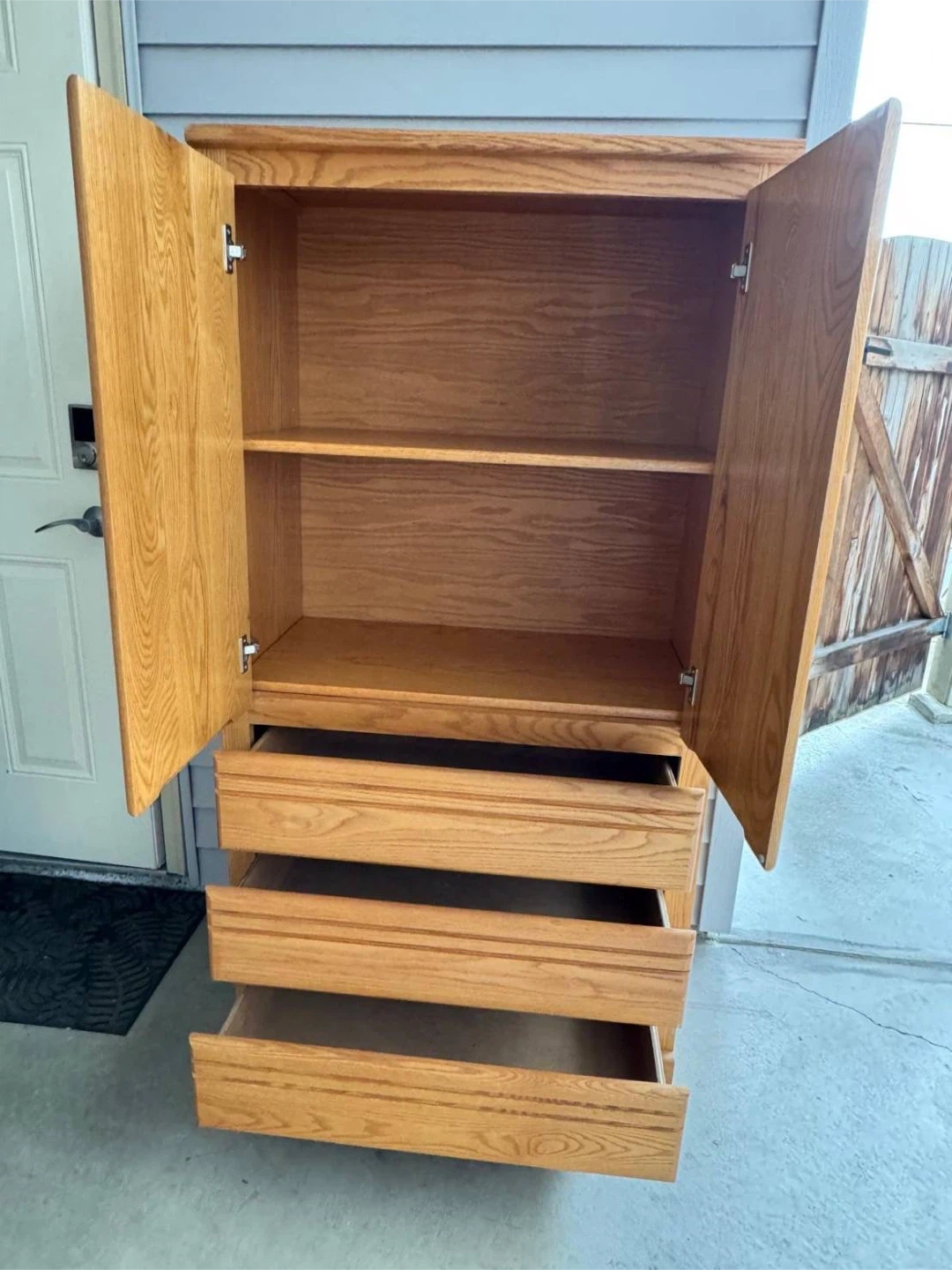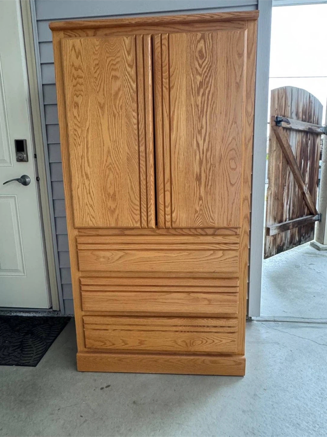 This wooden wardrobe armoire offers ample storage with two doors and three drawers. It's made of natural wood with a warm oak finish. Perfect for organizing clothes or linens!