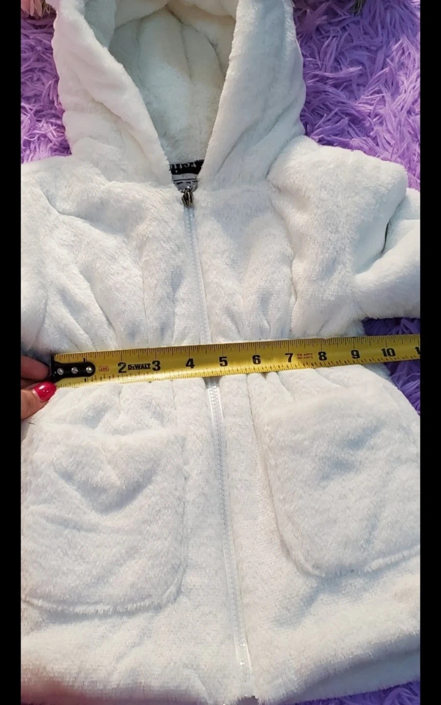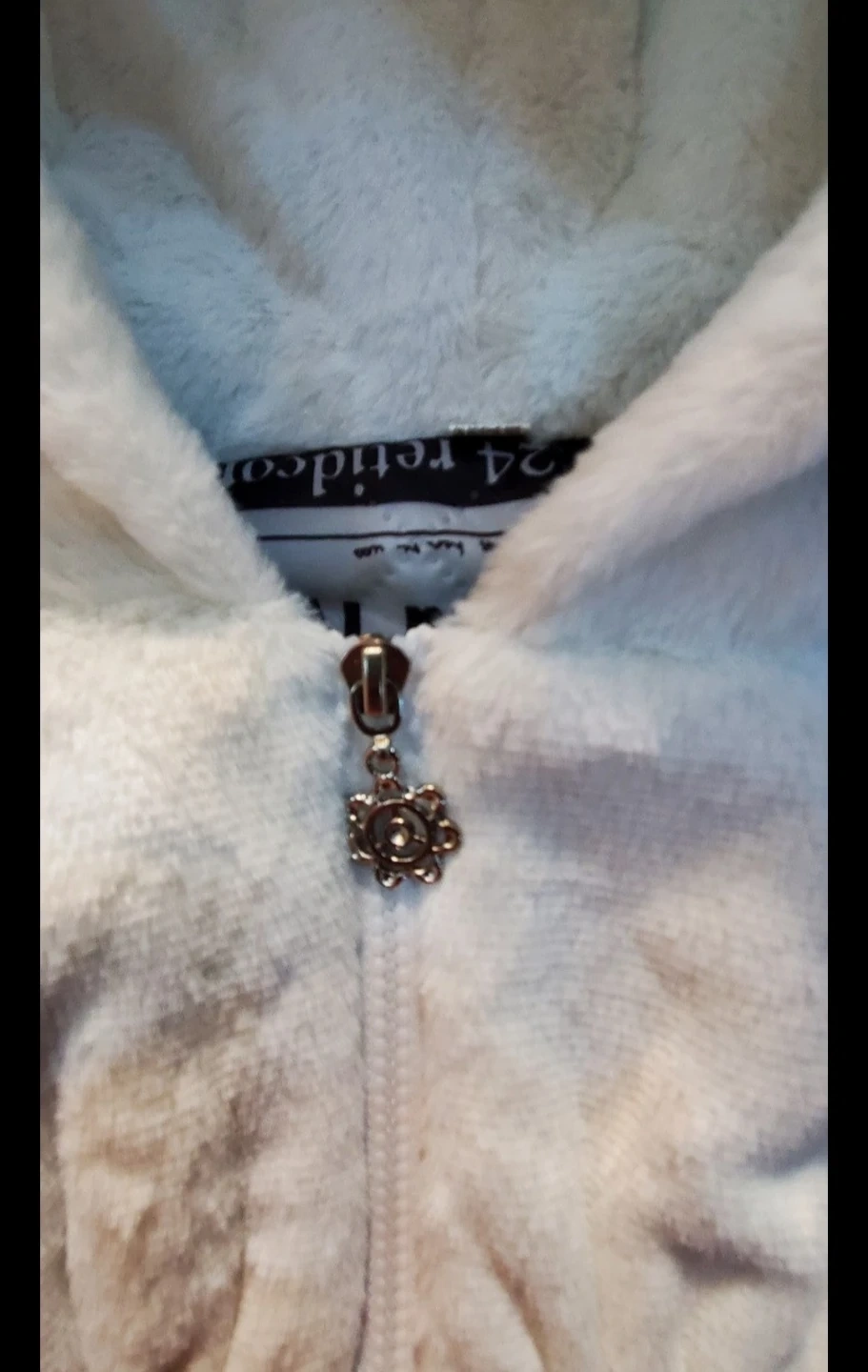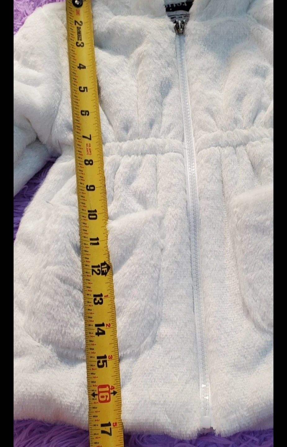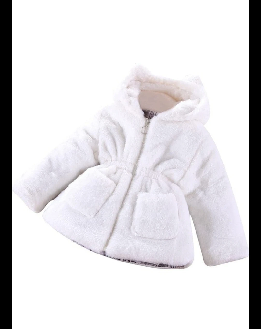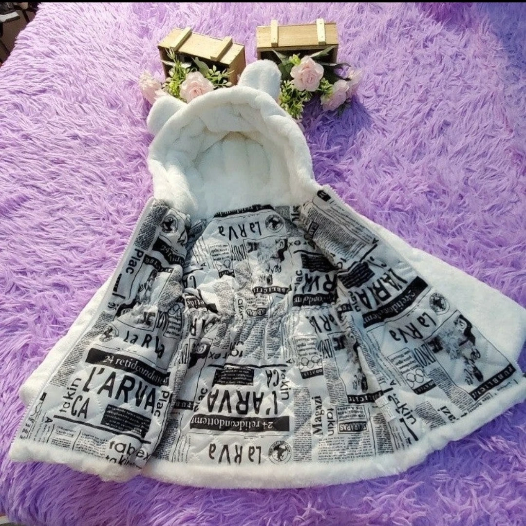 Cozy white faux fur jacket with a soft fleece lining printed with newspaper graphics. It features a drawstring waist and two front pockets. Comes with a cute flower zipper pull!Size 100 toddler fits 2-3years old depending on your kids reference please see measurement