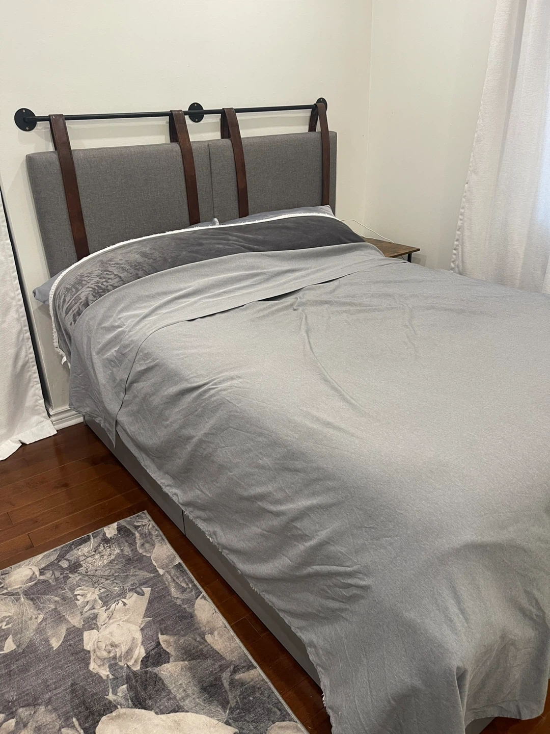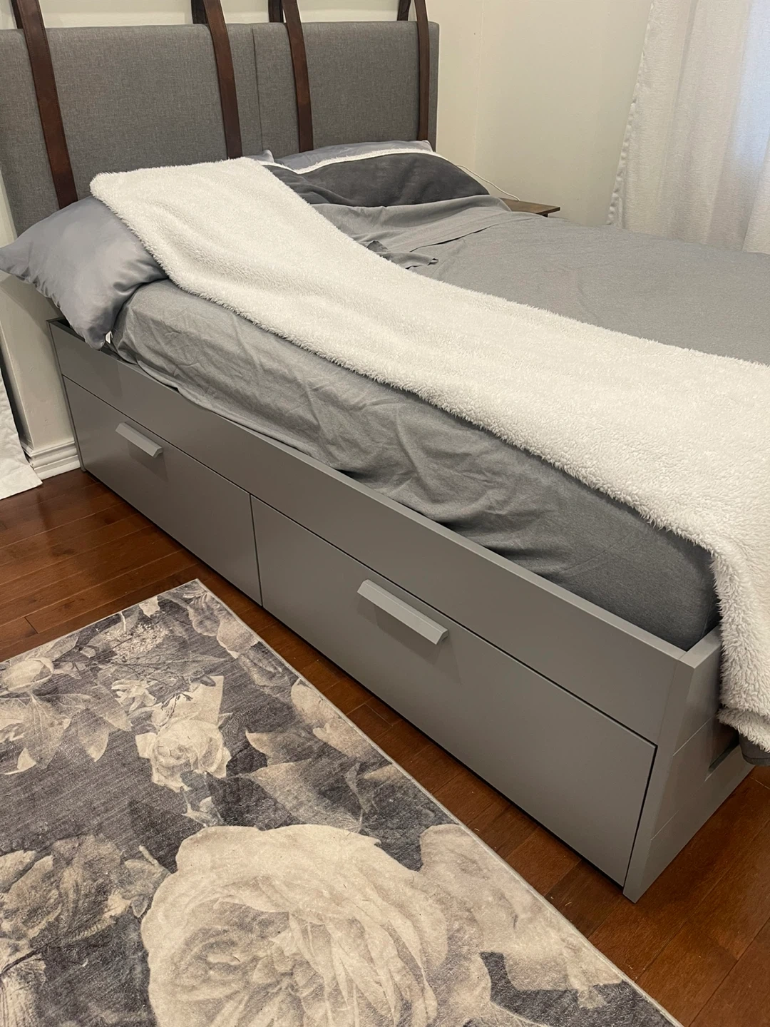 IKEA BRIMNES twin bed frame in gray, featuring built-in storage drawers ($369+tax). Headboard is from Stuctube (Nino modern suspended headboard $129+tax). This bed frame is great for maximizing bedroom space.