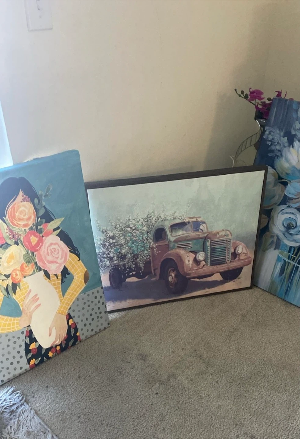 Set of decorative wall art pieces. Includes floral prints, a vintage truck scene, and inspirational quote signs. Great for adding a touch of personality to any room!
