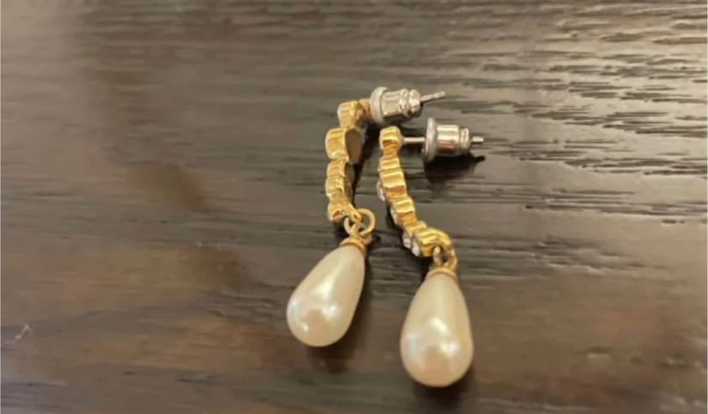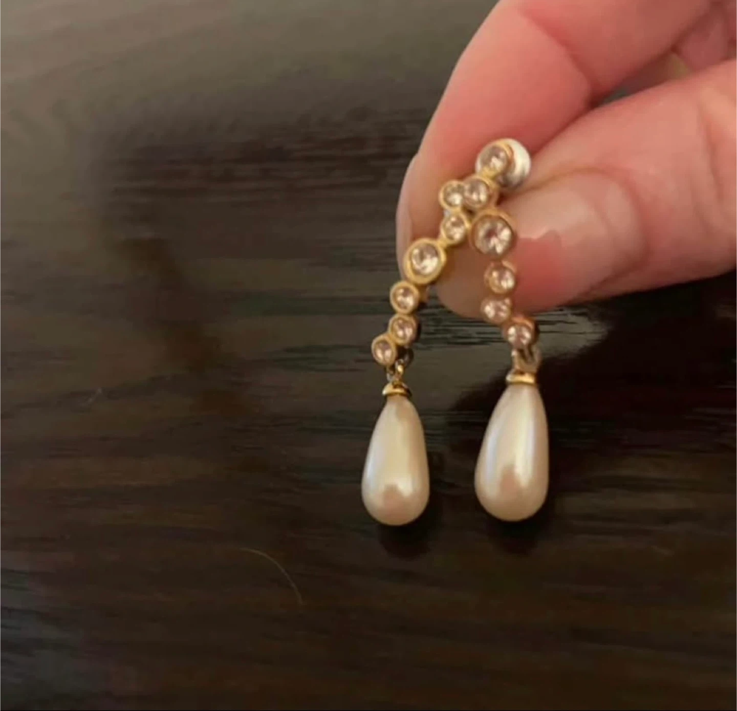 These are a pair of elegant pearl drop earrings. They feature a gold-tone setting with sparkling stones leading to the pearl drops. Perfect for adding a touch of sophistication to any outfit! 80’s/90’s