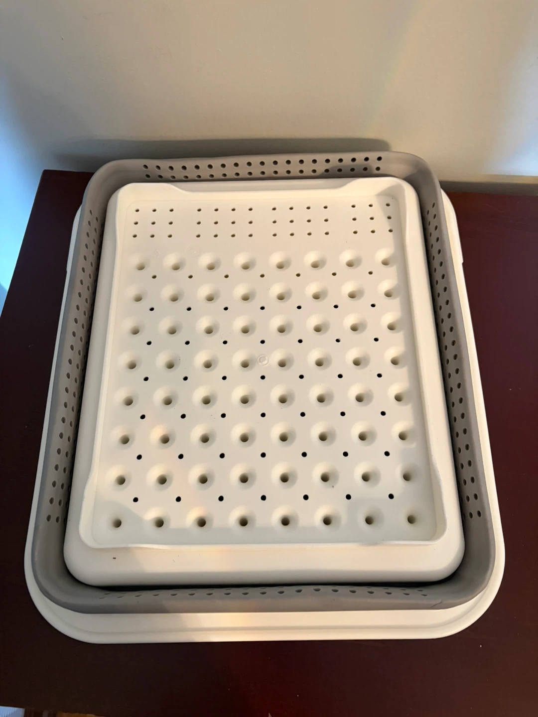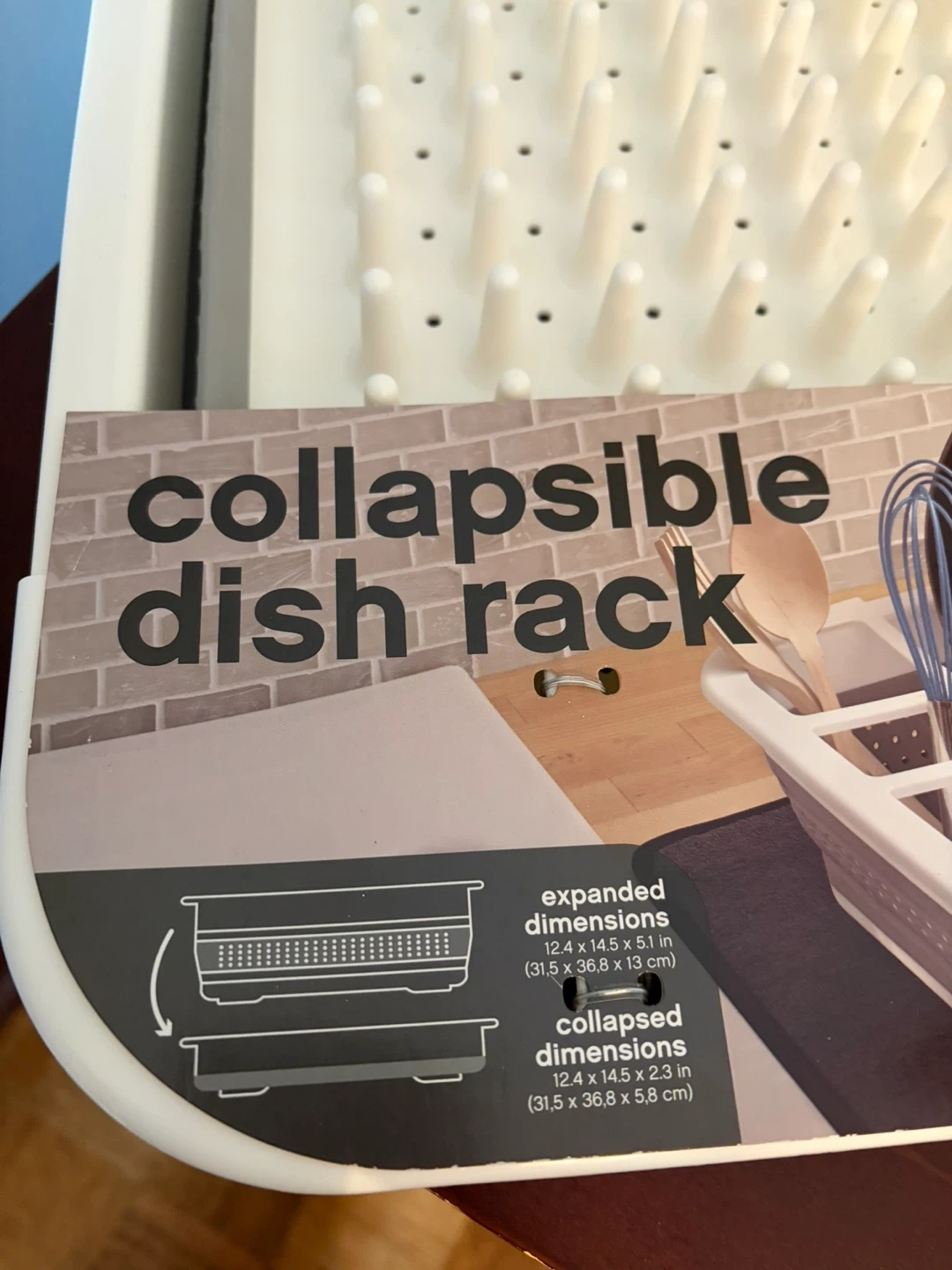 This is a white and grey Madesmart collapsible dish rack. It has expanded dimensions of 12.4 x 14.5 x 5.1 inches and collapsed dimensions of 12.4 x 14.5 x 2.3 inches. It's great for small kitchens or for extra drying space when needed!