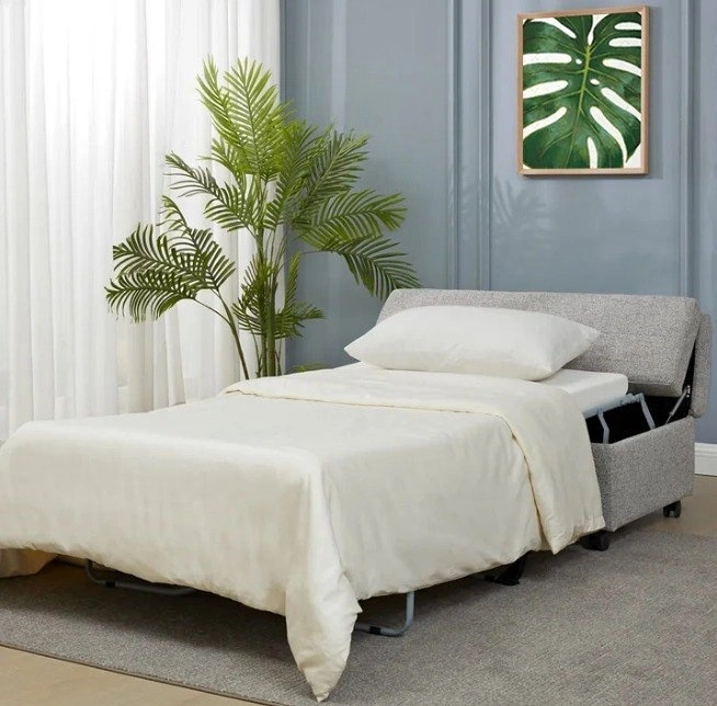 Emorie sleeper ottoman that turns into a bed. This is a great alternative to a sofa bed, perfect for guests. It's made with polyester fabric upholstery, high-density foam, and a premium sleeper frame that eliminates the uncomfortable bar you might feel in other models. The mattress is 5.1 cm (2 in.) foam with a 2.5 cm (1 in.) gel topper. It has a solid hardwood frame and locking casters for easy moving. Assembly is required.