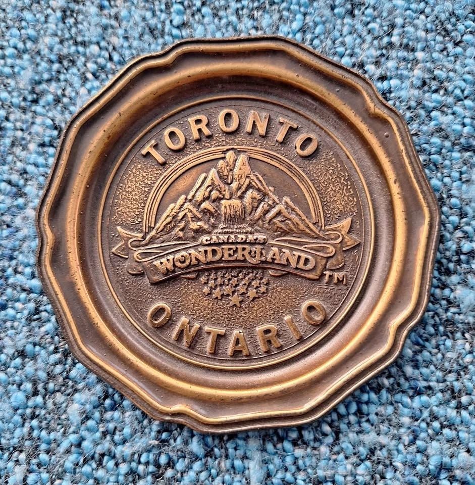 This bronze-tone metal medallion is an authentic souvenir from Canada's Wonderland's 1981 inaugural year. It bears the inscription 'Toronto, Ontario' and was manufactured in Canada by Century. Measures approximately 3 inches in diameter, making it a nice display piece.