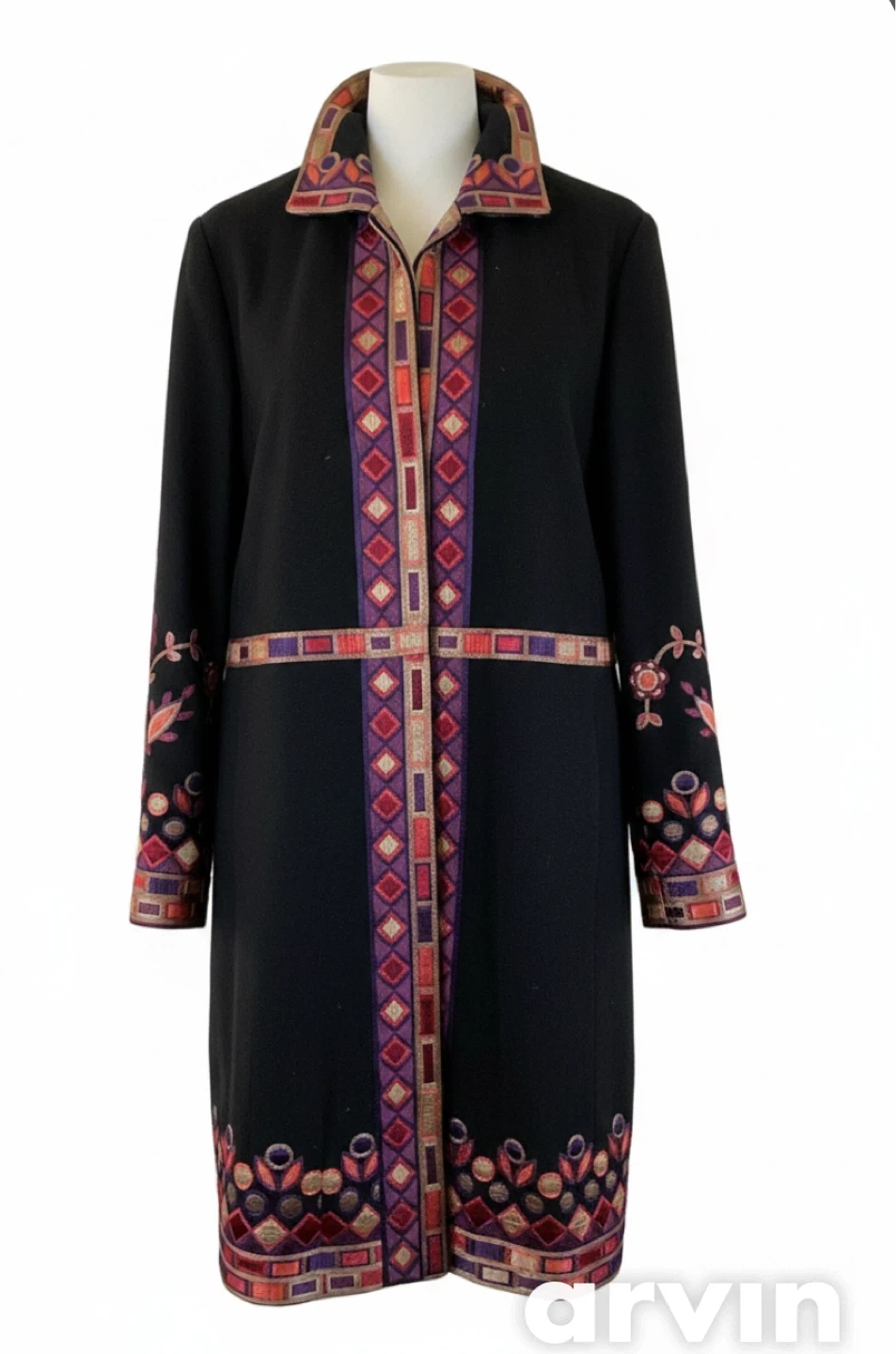 This black coat features vibrant embroidered details along the collar, placket, sleeves, and hem. It has a stand-up collar and a straight-cut silhouette. The embroidery showcases a mix of geometric diamond patterns and floral motifs in shades of purple, red, and orange.