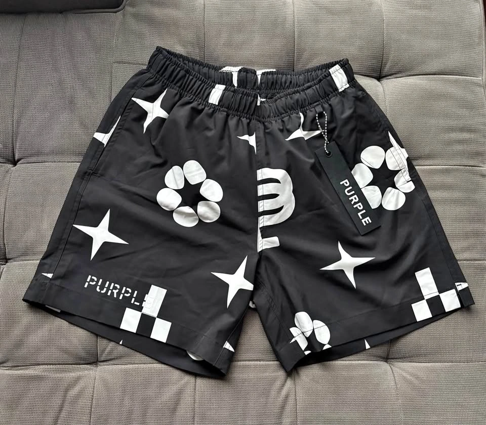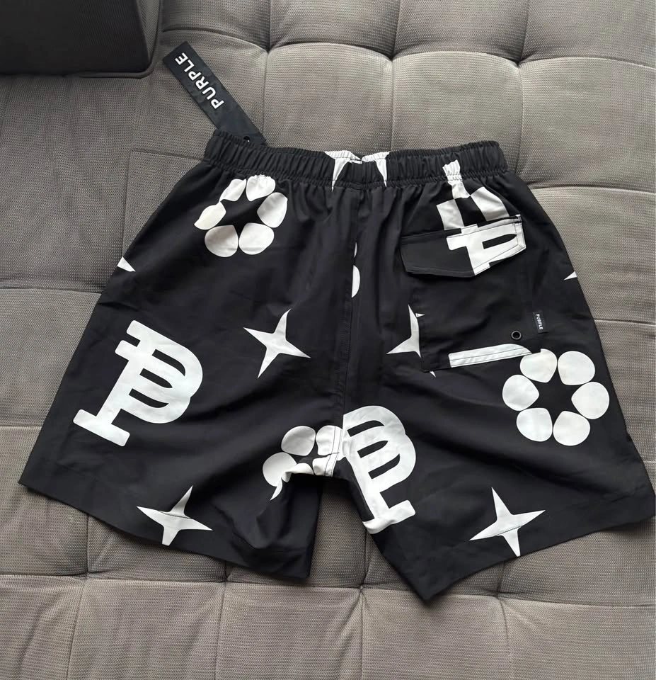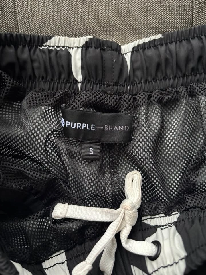 Brand new Purple Brand monogram swim shorts with tags. Clean black and white all-over print featuring signature Purple branding. This is a premium P504 model. Size S. Authentic Purple Brand. Elastic waistband with drawstring. Mesh lining + back pocket. Minimal black/white monogram design (easy to style). Perfect for summer, vacation, or everyday streetwear fits.