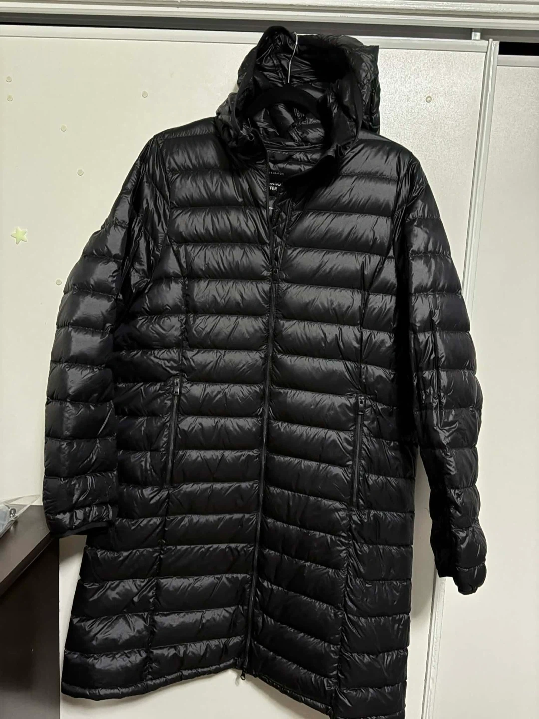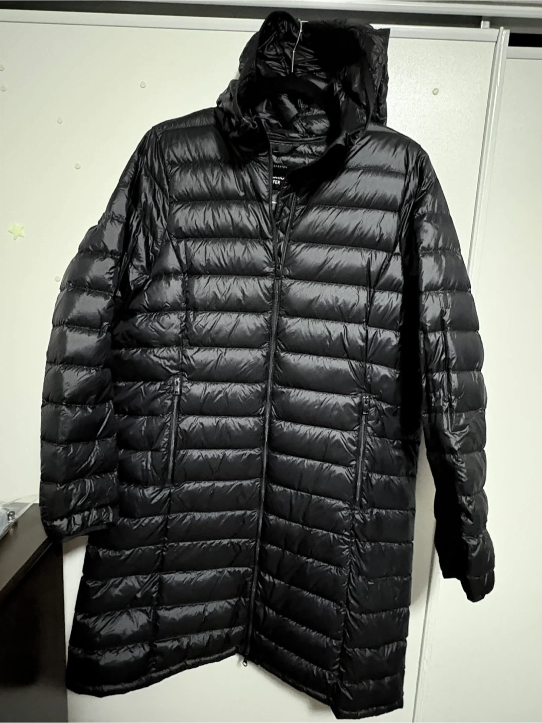 Black goose down puffer jacket with a hood. It's packable and lightweight. Includes a stuff sack for storage. This jacket is great for cold weather layering. The foundation puffer