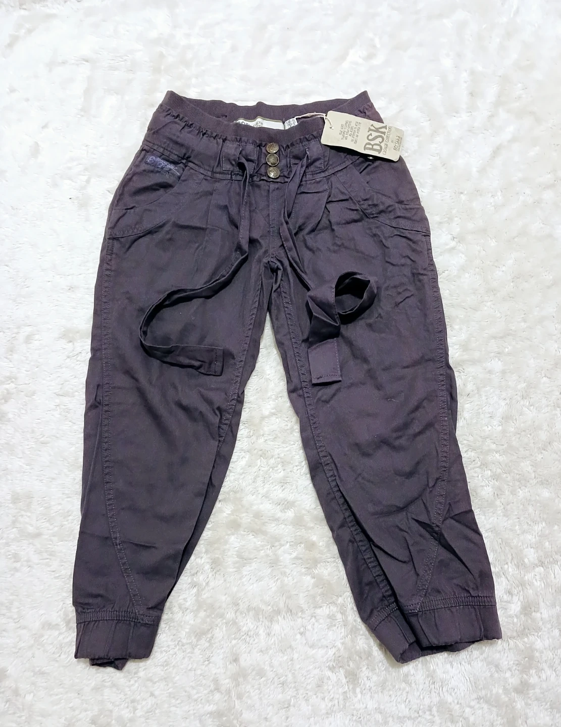 These BSK capri pants are a stylish addition to any wardrobe! They come in a lovely purple colour and feature a comfortable design. Perfect for casual outings or everyday wear.