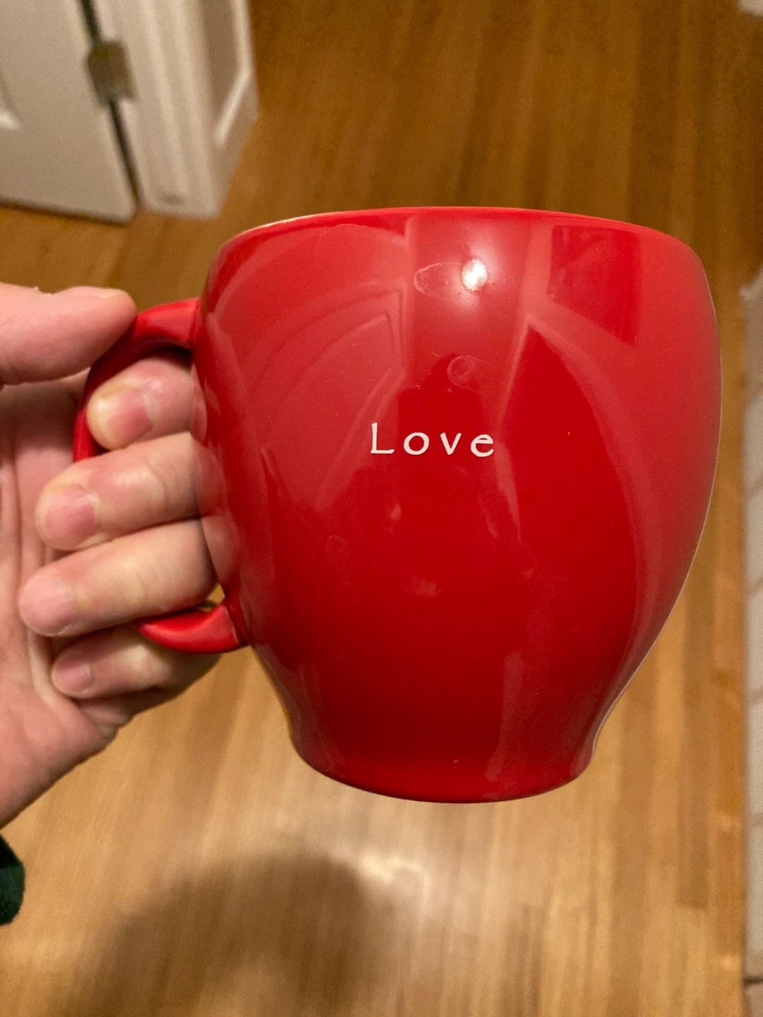 A red Starbucks coffee mug with "Love" printed on the outside. It's microwave and dishwasher safe. Made in China. The inside features a red Chinese character for love.