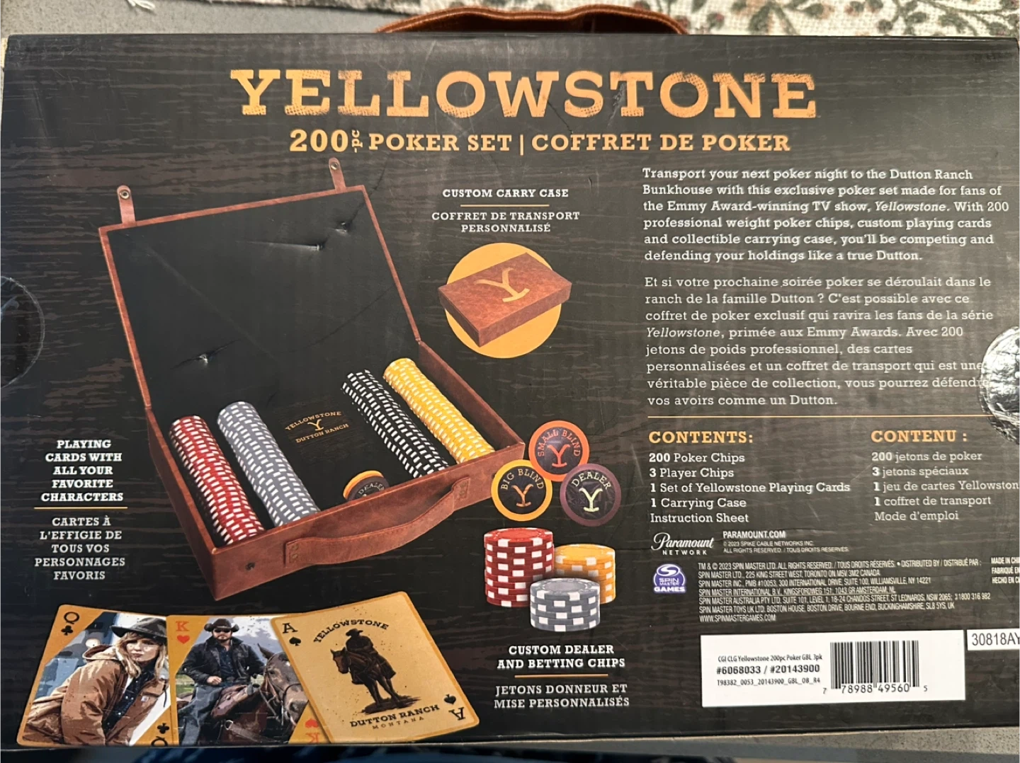 Selling a Yellowstone 200-piece poker set! It comes with 200 poker chips, 3 player chips, 1 set of Yellowstone playing cards, and 1 carrying case. The set also includes an instruction sheet. Perfect for fans of the show!