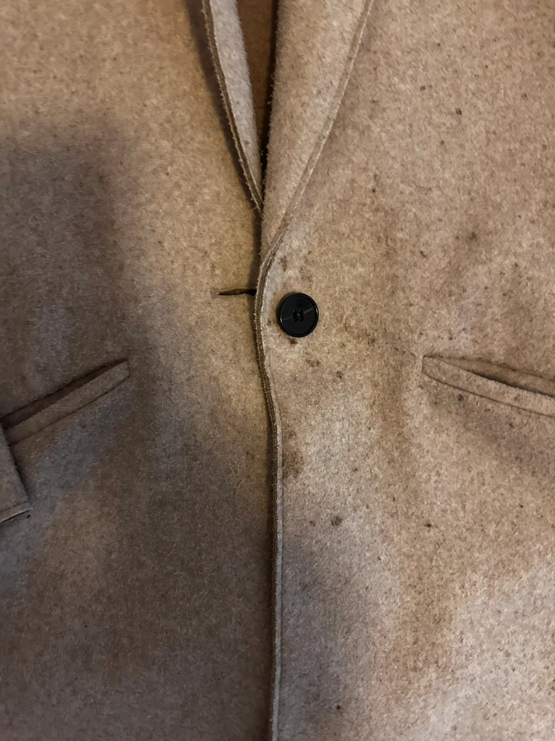 Beige wool blend blazer from TRF. It's a size medium and features a single button closure and two front pockets. Some minor marks on the fabric.