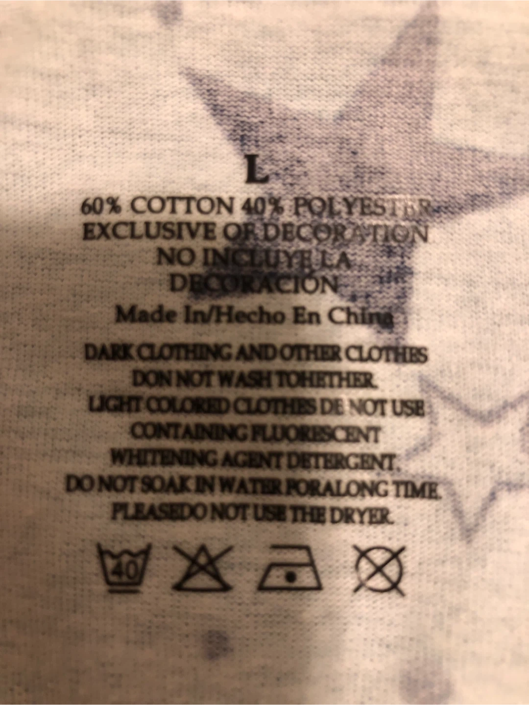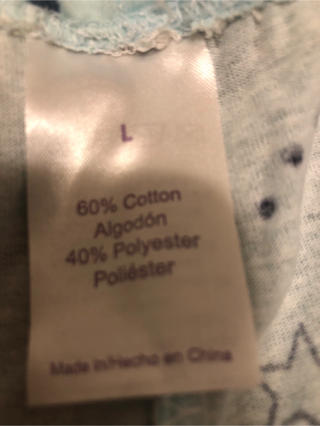A comfortable light blue pajama set with a starry night pattern. It's made of a 60% cotton and 40% polyester blend. This set is size large and perfect for lounging at home!