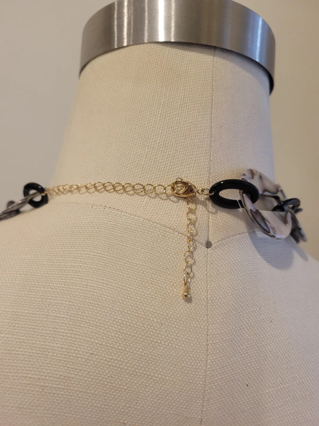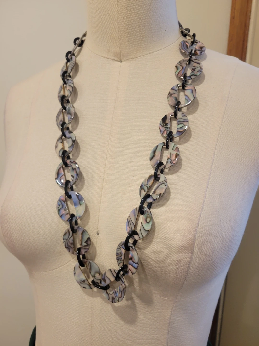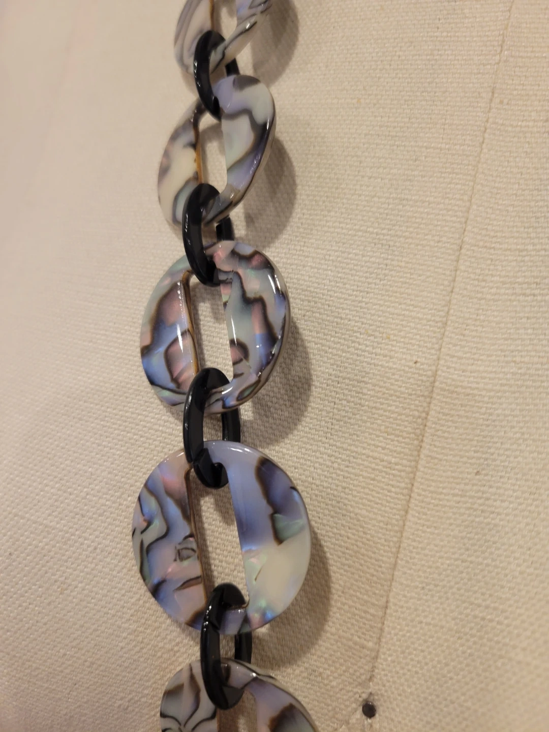 This necklace features large, oval-shaped resin links with an abalone-like swirl pattern. It has black plastic spacer beads and a gold-tone adjustable clasp. It's a statement piece with a unique design. Meetup location eglinton and dufferin area