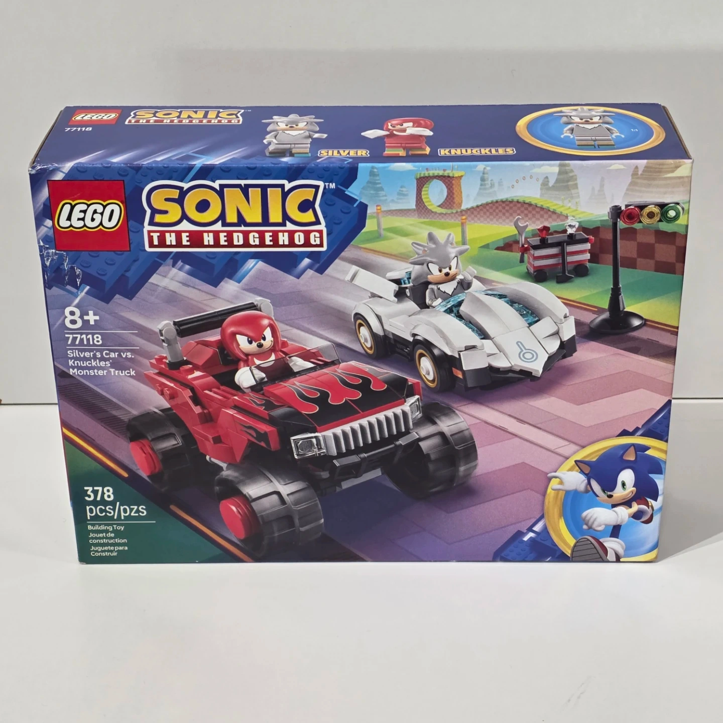 Build and race with this LEGO Sonic the Hedgehog set featuring Silver's Car and Knuckles' Monster Truck. It includes 378 pieces and characters like Silver, Knuckles, and Sonic. This set is recommended for ages 8 and up. It's perfect for fans of Sonic and building adventures!